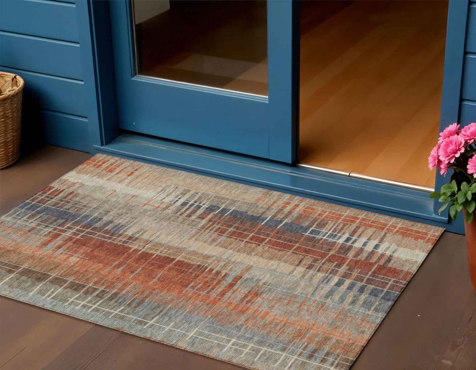 3' X 5' Khaki And Rust Striped Washable Indoor Outdoor Area Rug