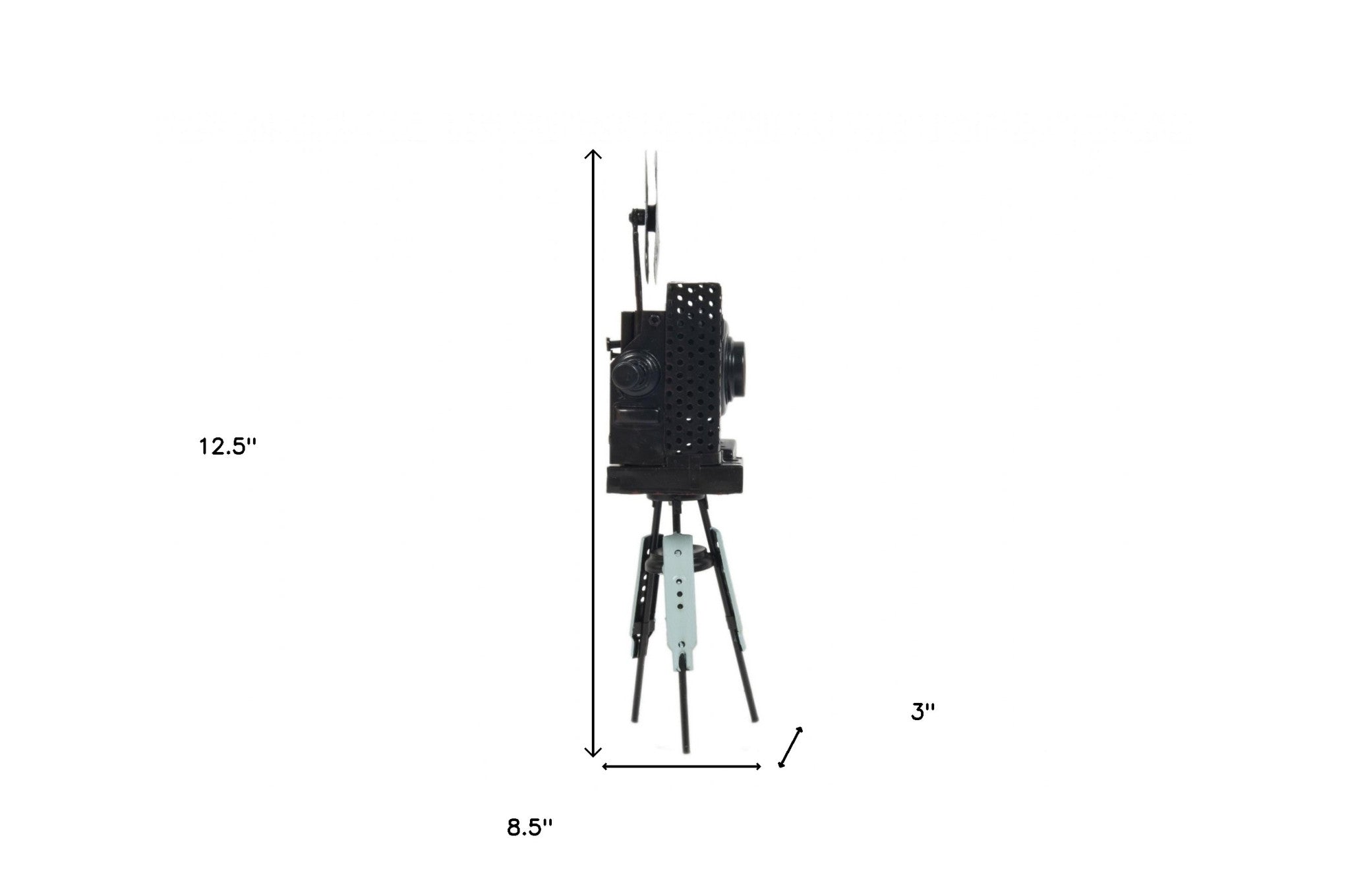 A movie projector is an optomechanical device for displaying motion picture film by projecting it onto a screen. Most of the optical and mechanical elements, except for the illumination and sound devices, are present in movie cameras. Our vintage movie projector is handmade out of the tin and covered in black rustic paint. It features many intricate details such as half-open case, two-reel system, lens, inching wheel, intermittent sprocket, sound head, focusing knob, and a stand. Proudly display this model anywhere you like and it will surely make a conversational piece. A must-have for the collector and enthusiast!