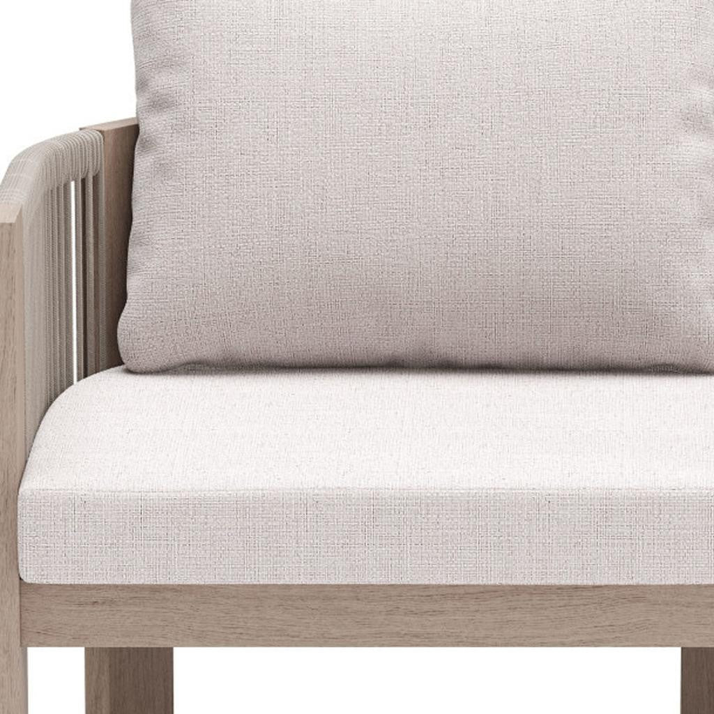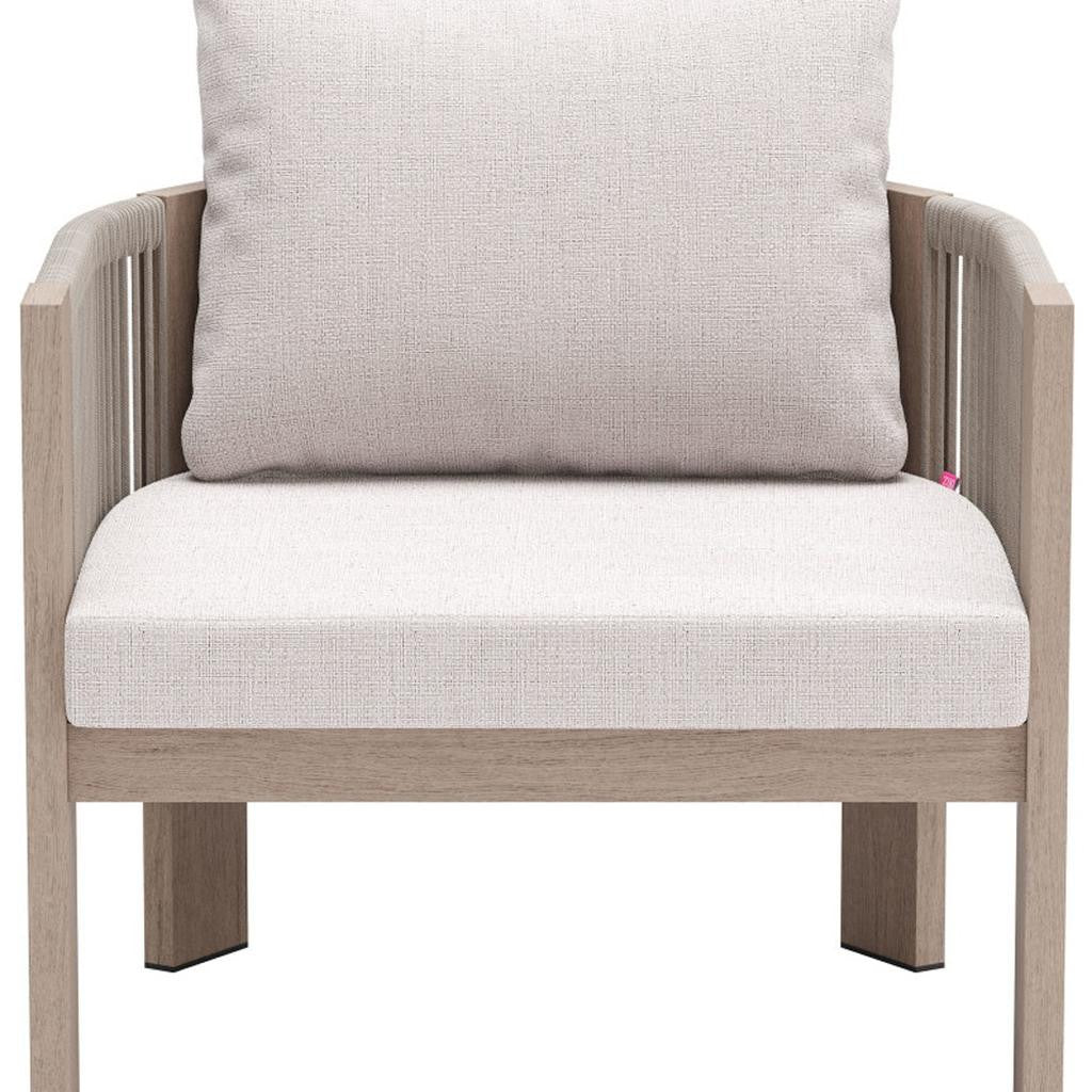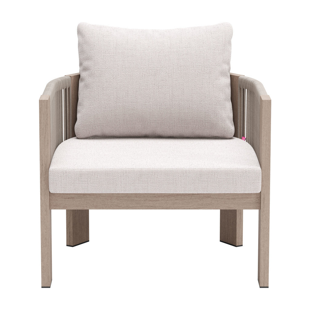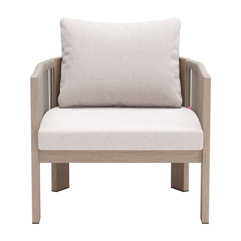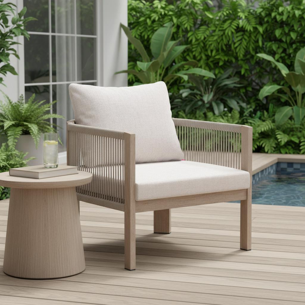 Enjoy the good life every day with this fashionable outdoor seating option designed as an arm chair with a modern style. The beige olefin upholstery complements the solid color accent chair pattern, featuring a cushion back for added comfort. Crafted with metal arms and legs in a brown finish, this slipcovered chair boasts a removable cushion cover for easy cleaning. Upholstered in beige, the aluminum frame ensures durability, making it a stylish addition to your outdoor living space. 32.3-inch h x 31-inch w x 31-inch d.