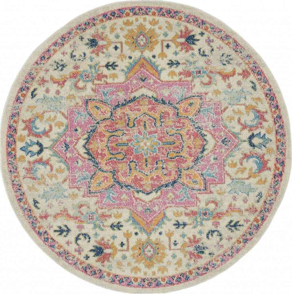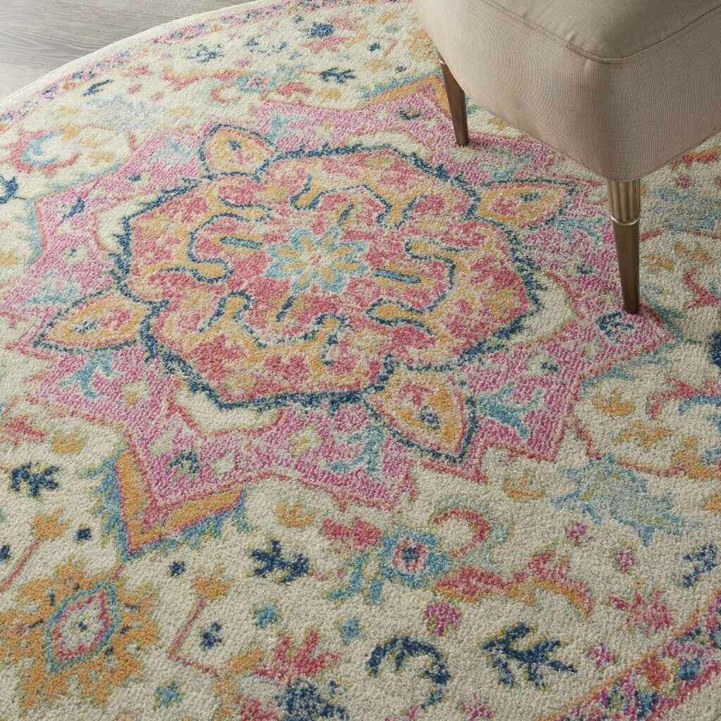 This 5’ round ivory and pink medallion area rug, is a great way to add warmth to a room. This geometric round shaped rug features a southwestern pattern in pink and ivory that combines a good looking print with a unique and updated shape. The mix of shape, color, and design gives this rug refreshing visual interest. Made in Turkey, this rug offers high quality combined with good looking designer sensibilities. Area Rugs help to give warmth and sense of home to your space. 1" H x 63" W x 63" D