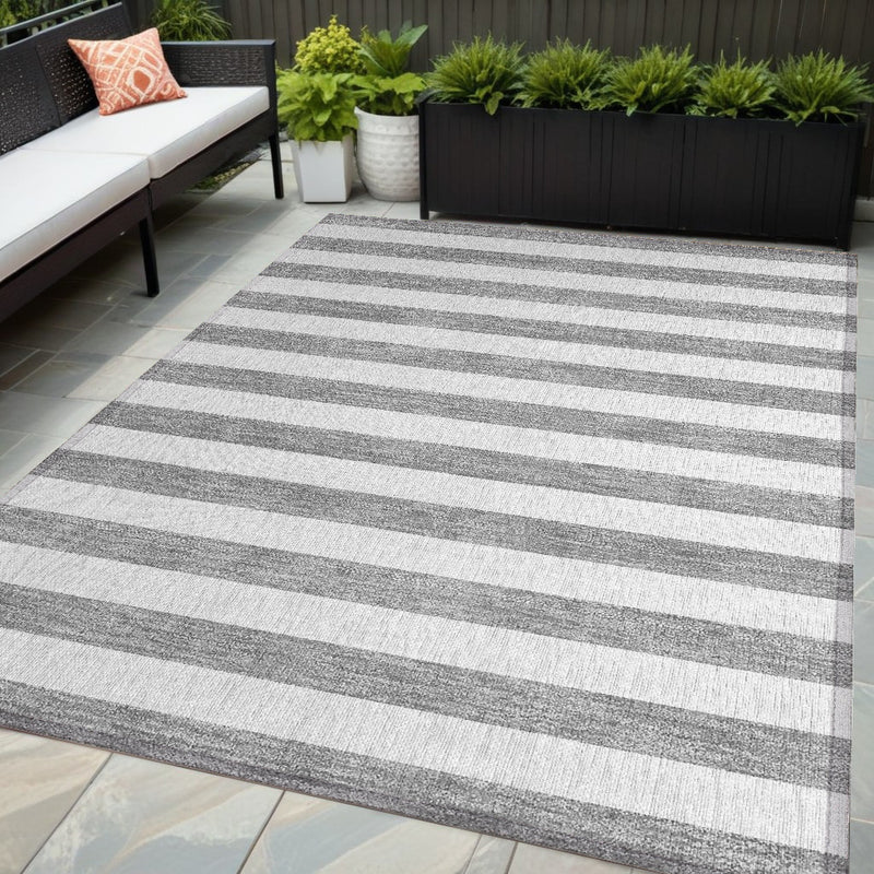 Add some artistry to your room with this 5-foot x 8-foot gray and white striped washable stain resistant non skid indoor outdoor area rug. This rectangle shaped rug features a striped design in gray and white to give it visual interest. A classic shape marries with good looking design for your space the coloring of this rug adds a delightfully neutral tone to your home and will easily match with most any decor. Ideal for spaces with kids and pets, this rug is stain resistant to help repel stains and spilled liquids. Area rugs help to give warmth and sense of home to your space. 60-inch H x 90-inch W x 0.19-inch D