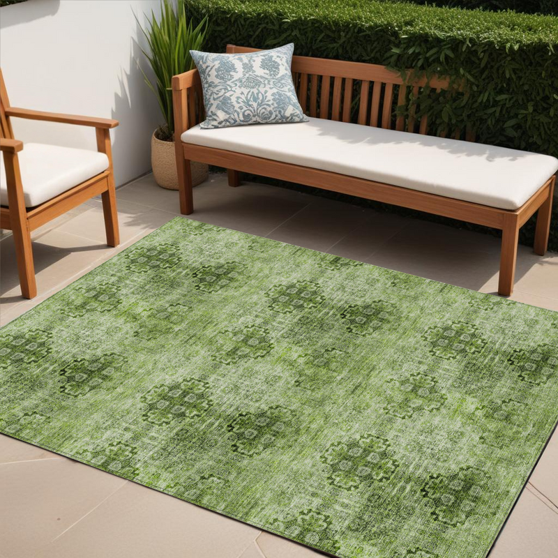 5' X 8' Olive Green Floral Medallion Washable Non Skid Indoor Outdoor Area Rug
