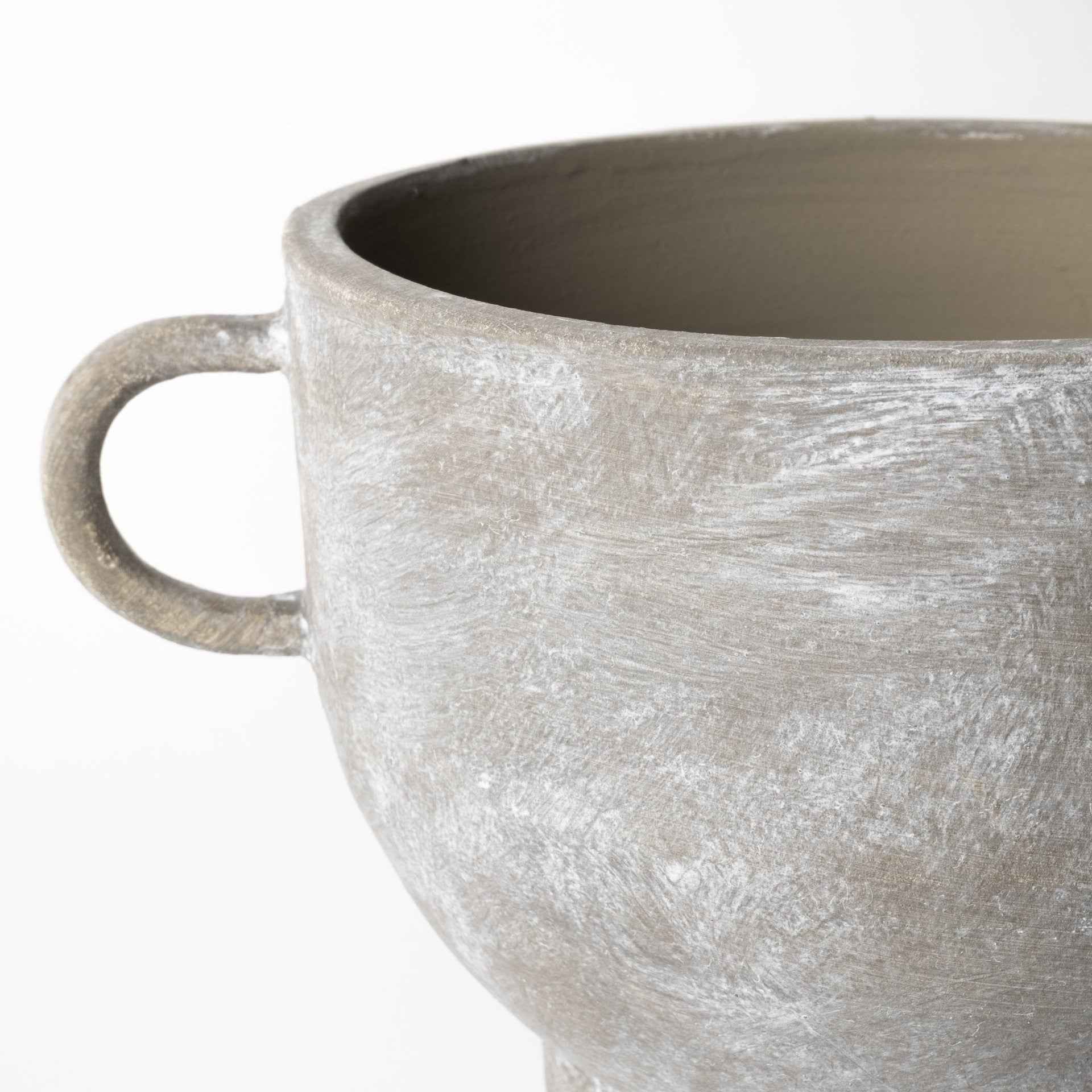 Bring in a touch of rustic design to your home with this Petite Vintage Brown Ceramic Vase. This vase is made from ceramic and has a bowl shape with a raised base and two handles on either side. The finish on the inside is a smooth clay brown while the outside has a distressed finish on it in a white and brown colorway. This vase is a unique piece that can be used to display succulents or smaller plants or it can be used as a decor piece grouped with other similar pieces. 7" H x 8" W x 11" D