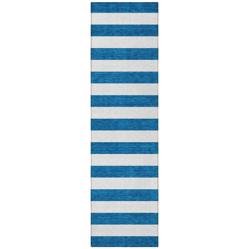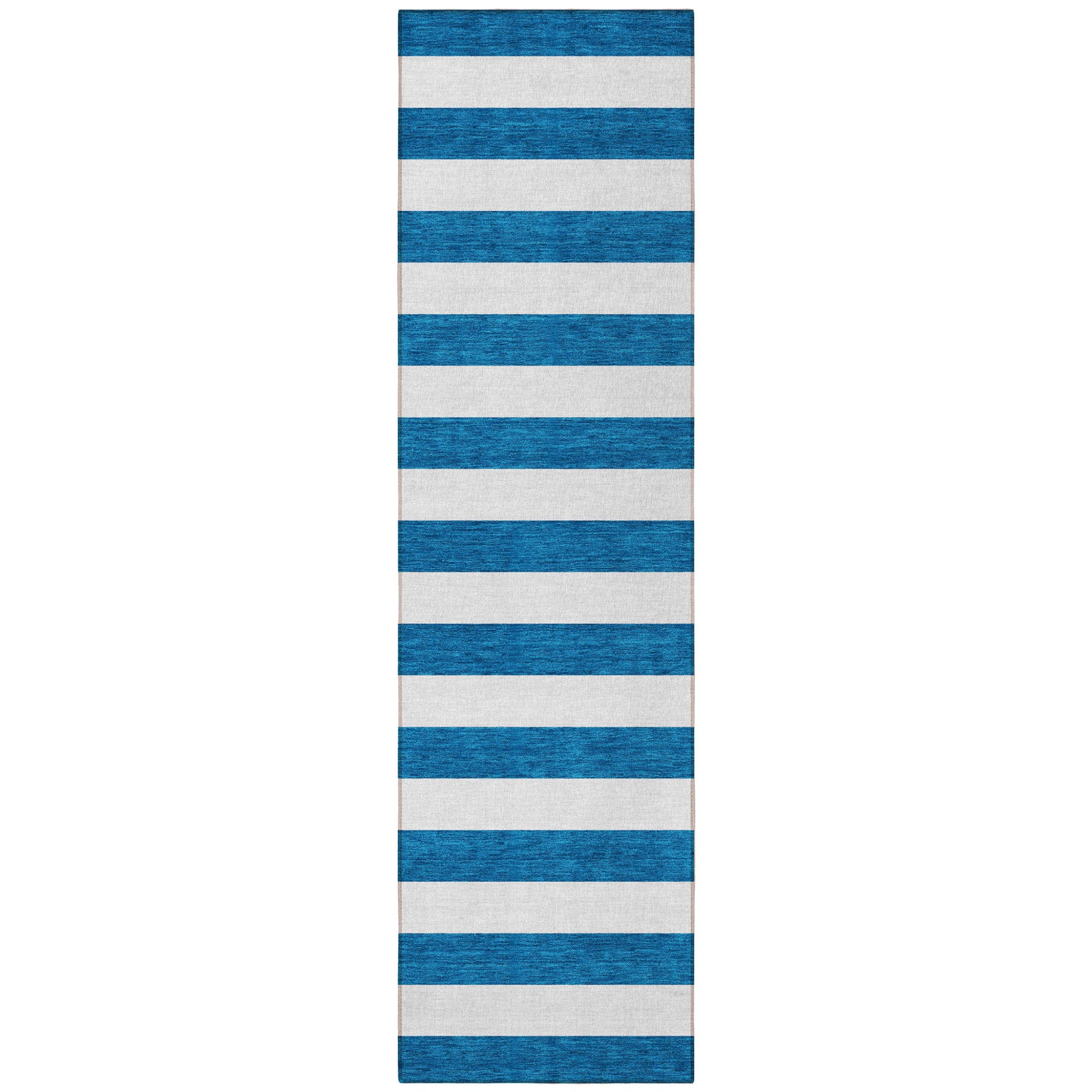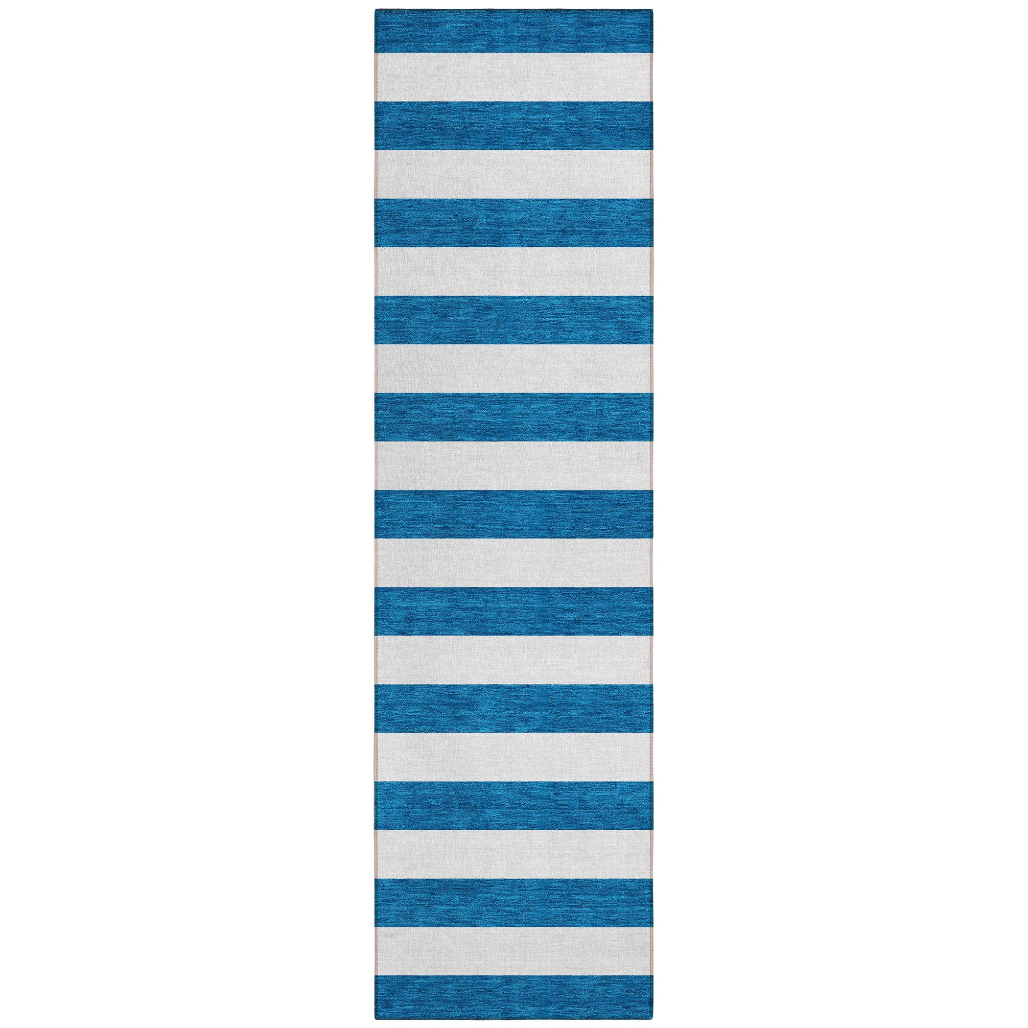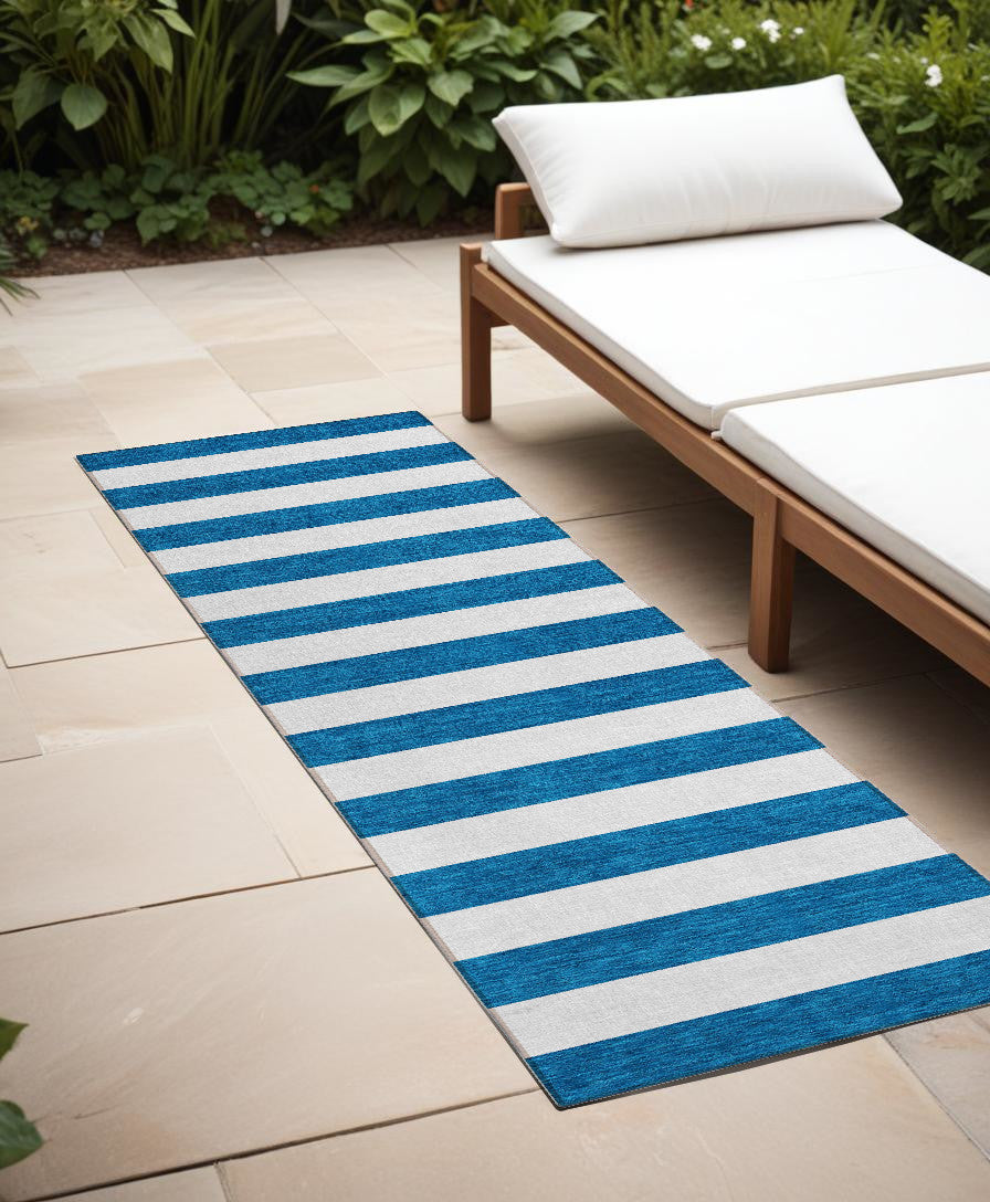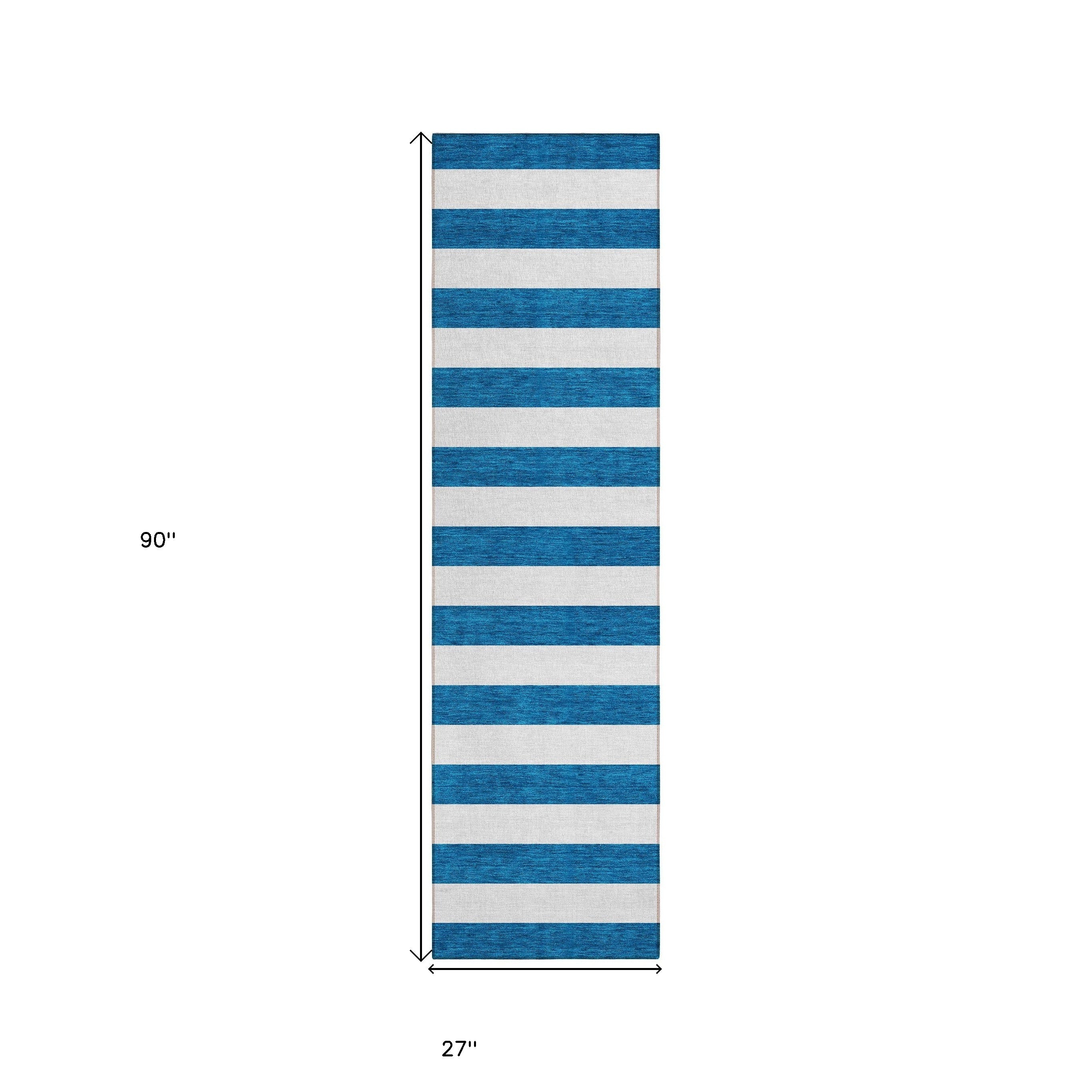 Set an inviting tone in your space with this 8-foot runner navy blue striped washable stain resistant non skid indoor outdoor runner rug. This runner shaped rug features a striped design in navy blue to give it visual interest. A classic shape marries with good looking design for your space ideal for spaces with kids and pets, this rug is stain resistant to help repel stains and spilled liquids. Place this area rug against a hardwood or tile floor and it will enliven your living space with style and sophistication. 27-inch H x 90-inch W x 0.19-inch D