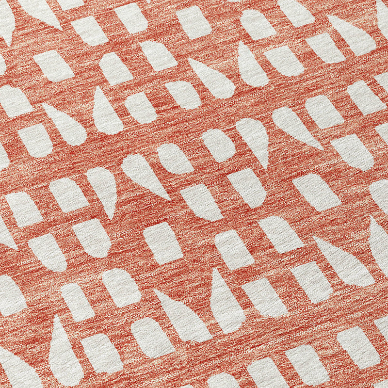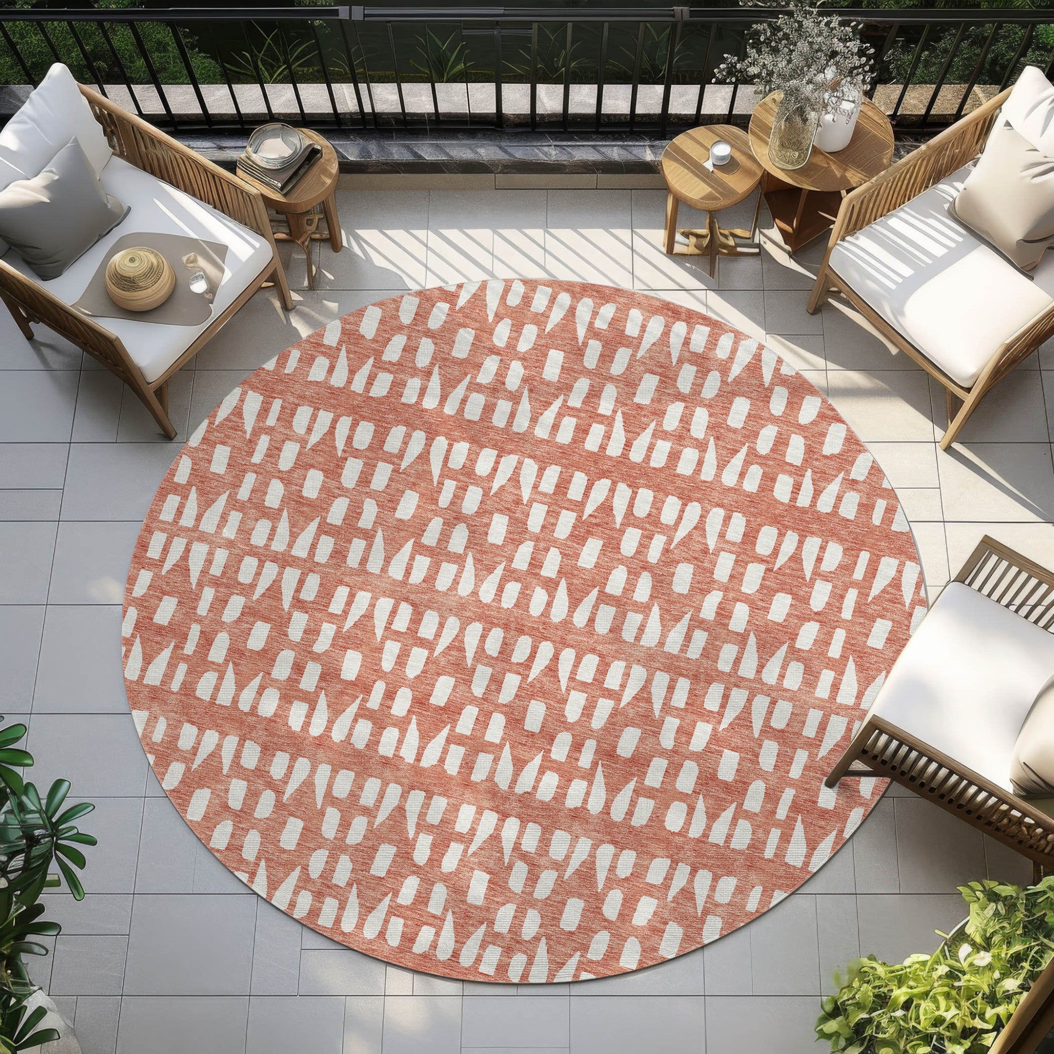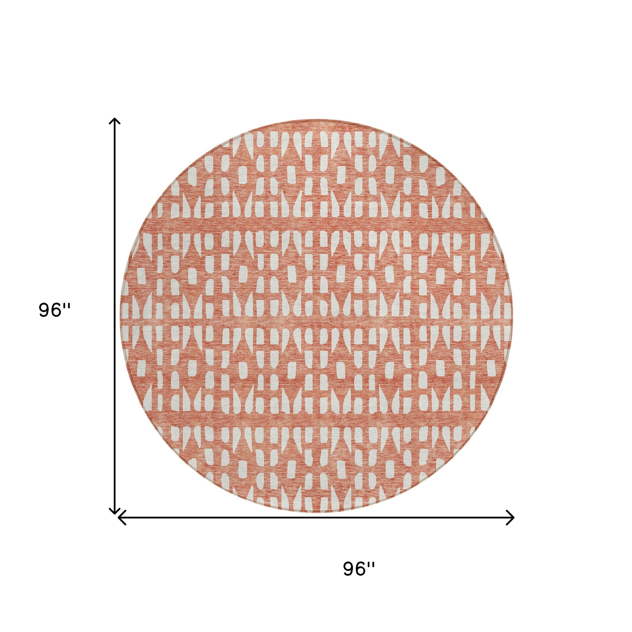 Add great coloration and comfortable texture to your space with this 8-foot salmon and ivory round geometric washable indoor outdoor area rug. This geometric round shaped rug features a geometric pattern in salmon and ivory that combines a good looking print with a unique and updated shape. The mix of shape, color, and design gives this rug refreshing visual interest. Ideal for outdoor spaces or high traffic areas with kids and pets, this rug is made from heavy duty polyester that is stain resistant to help repel water, dirt, and stains. Makes a great way to dress up your patio, porch, or poolside, but also works well as a durable and easy to maintain option in the kitchen, family room, or mudroom. 96-inch h x 96-inch w x 0.19-inch d.