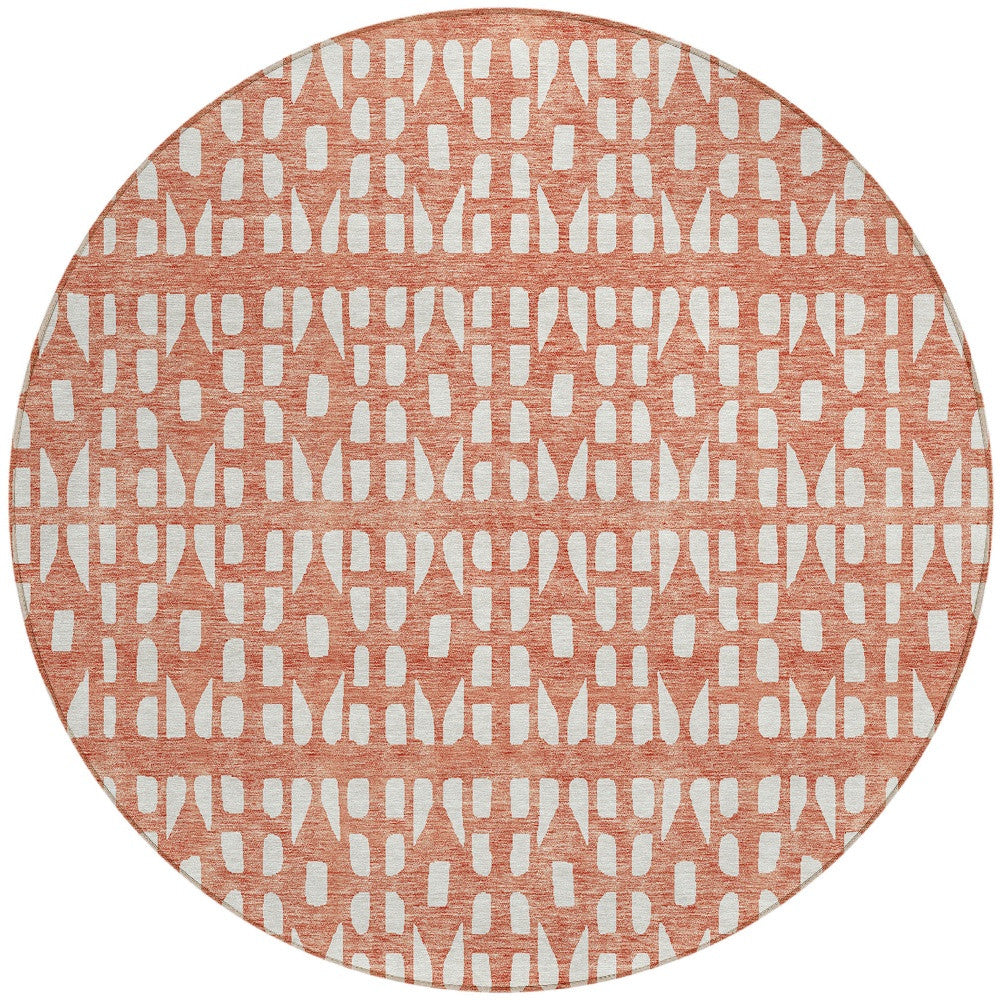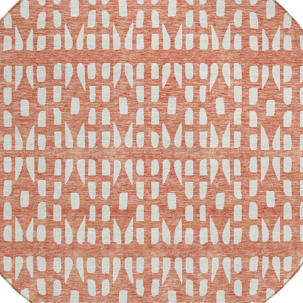 8' Salmon And Ivory Round Geometric Washable Indoor Outdoor Area Rug