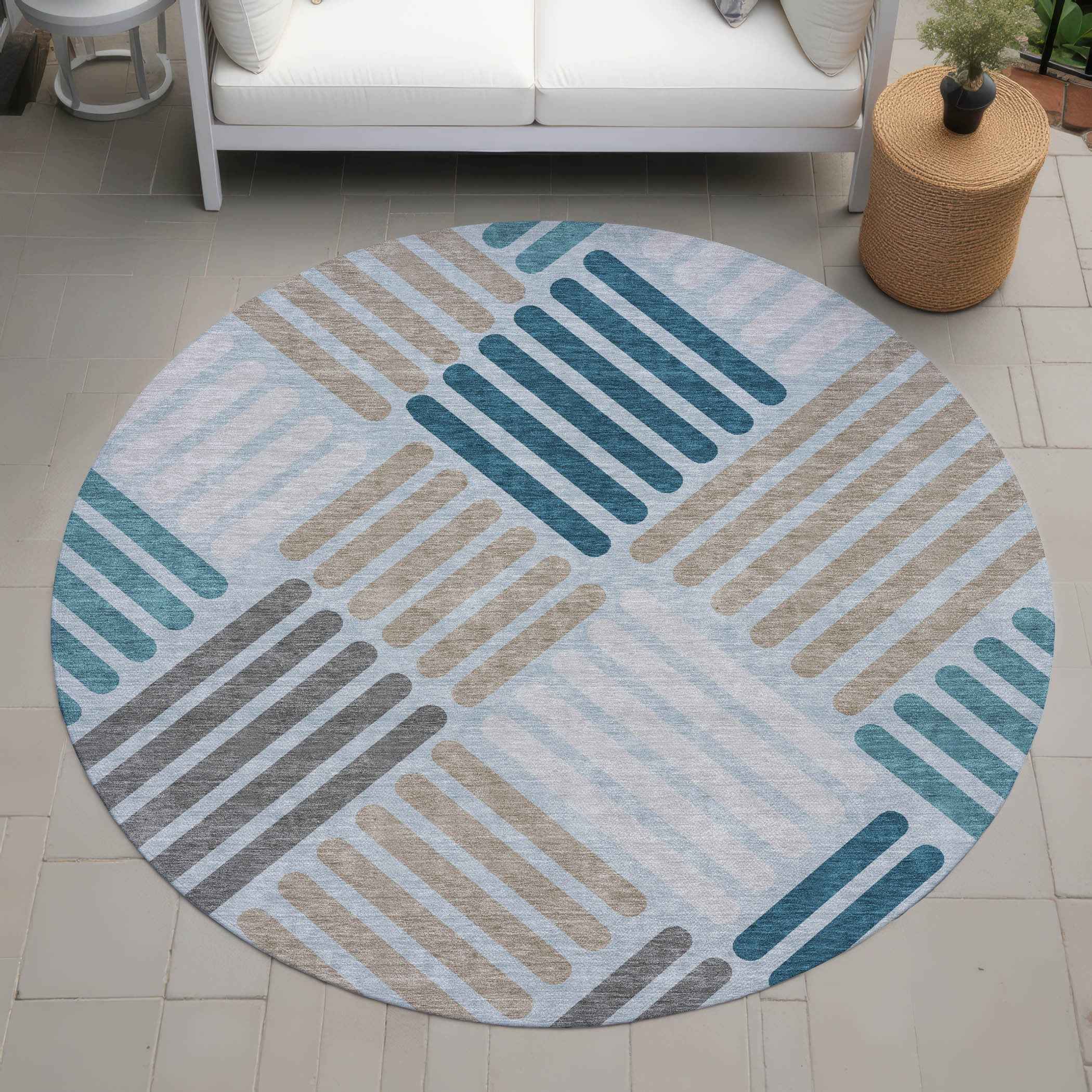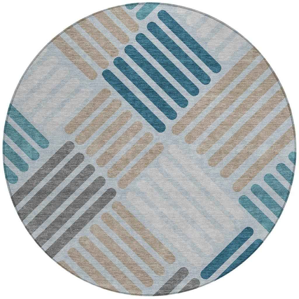 8' Teal Blue Wheat And Gray Round Geometric Washable Indoor Outdoor Area Rug