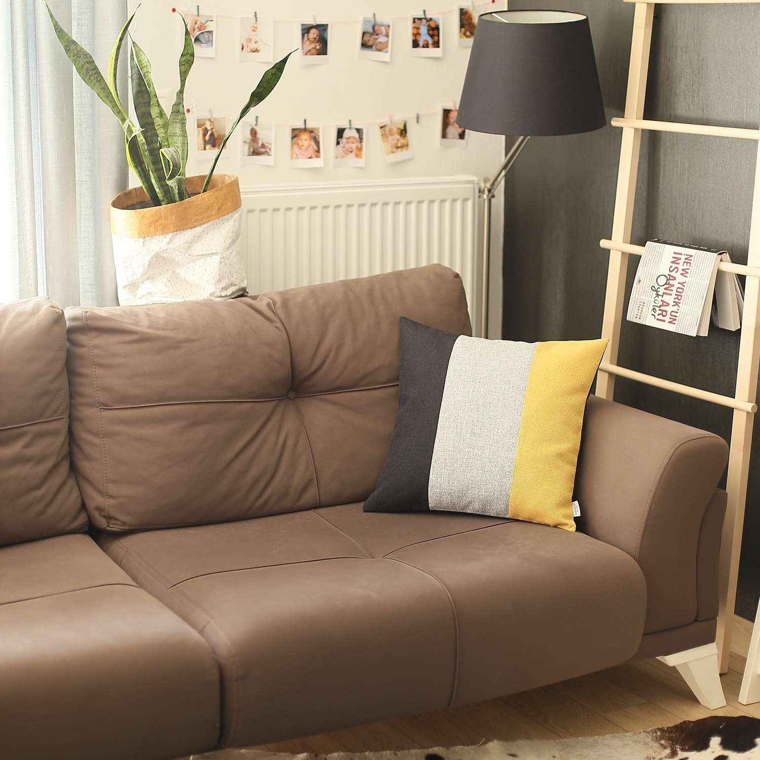 Expressing a playful spirit in modern sophistication, this Modern Yellow Tricolor Striped Throw Pillow will instantly enliven your living space. The tricolored symphony in charcoal black, distressed gray, and vibrant yellow is fashioned in three distinct segments that feel harmonious yet contrasting to the eyes. Upholding the exceptional craftsmanship of Turkish artisans, this pillow is made of 100% brushed polyester fabric with OEKO-TEX Standard 100 certification to ensure product safety, enhanced durability, and color intensity while making it easy for spot cleaning. It features a hidden zipper closure all around for a clean and seamless feel on the touch while the recycled poly filling inside adds to the fluffy look and enhanced comfort. Place this stylish and sophisticated pillow against bold or neutral shades to make your living space come alive in an instant. 18” x 18” x 1”
