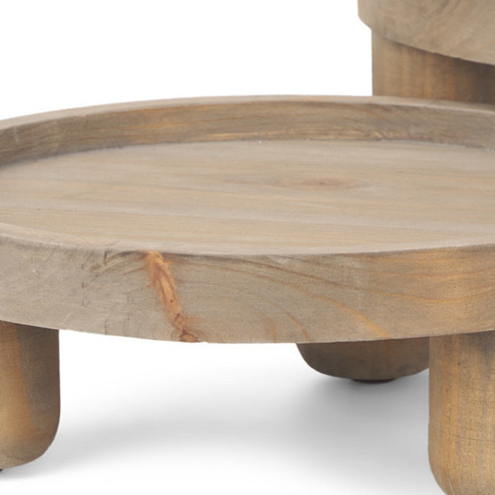 Accent your kitchen, dining room, living room, hall, or office in style with this set of two natural with gray wash solid wood round risers. Intended for decorative, non-direct food contact, these trays are great for serving or displaying a collection of bottles, candles, perfume, décor, and more. This riser arrives as a set of two giving you the versatility to use together or separately. Crafted from solid mango wood, these risers showcase an artisanal style and rustic charm that enhances any space. The purposeful distressing with wood scoring adds character and uniqueness to each piece. 5.75-inch h x 13.25-inch w x 13.25-inch d.