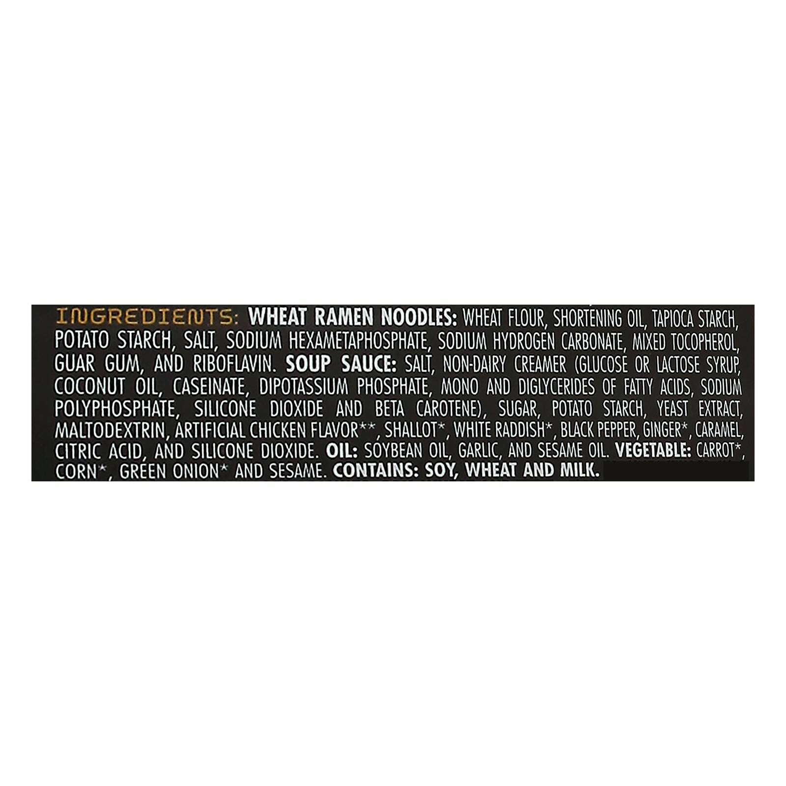 ingredients : wheat ramen noodles: wheat flour, shortening oil, tapioca starch, potato starch, salt, sodium hexametaphosphate, sodium hydrogen carbonate, mixed tocopherol, guar gum, and riboflavin;soup base: salt, non-dairy creamer (glucose syrup vegetable oil, dipotassium phosphate, sodium caseinate, mono and diglycerids of fatty acids, starch sodium octenyl succinate, silicon dioxide, sodium polyphosphate, datem, sodium chloride, and curcumin), sugar, potato starch, yeast extract, maltodextrin, natural chic