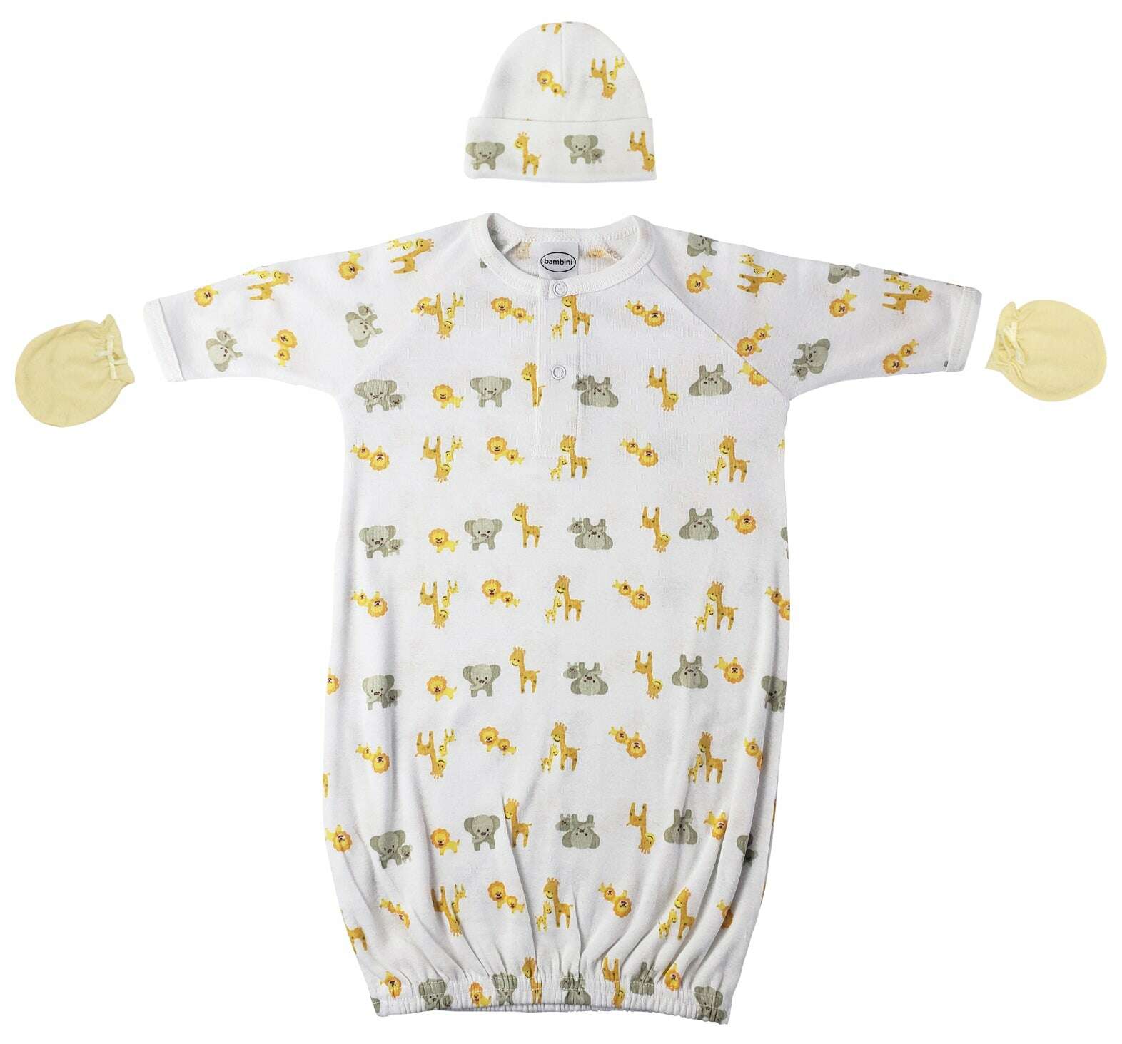 Unisex Print Gown (100% Cotton), Yellow Infant Mittens (Jersey), Printed Baby Cap (100% Cotton)