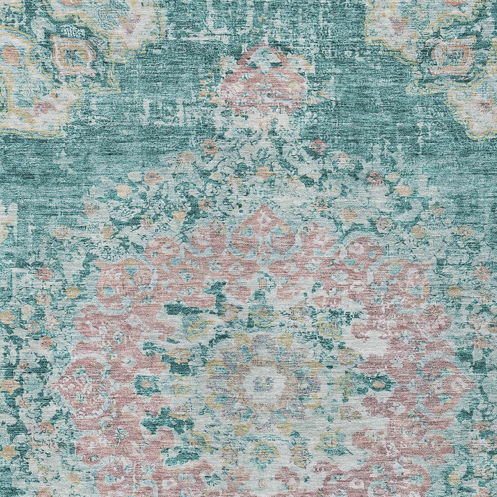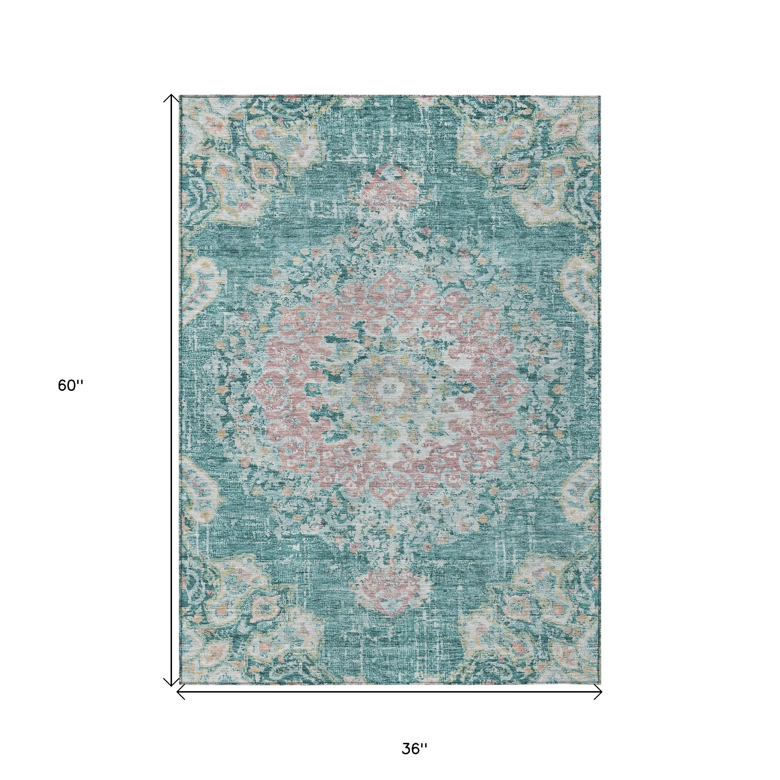 3' X 5' Teal Blue Floral Medallion Washable Indoor Outdoor Area Rug