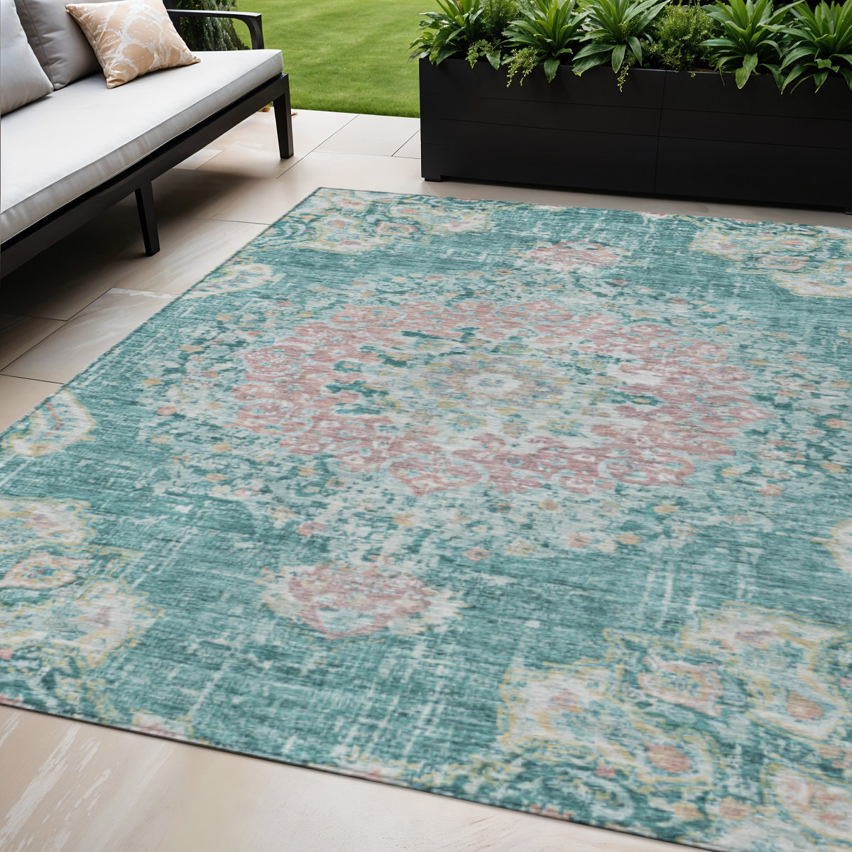 5' X 8' Teal Blue Floral Medallion Washable Indoor Outdoor Area Rug