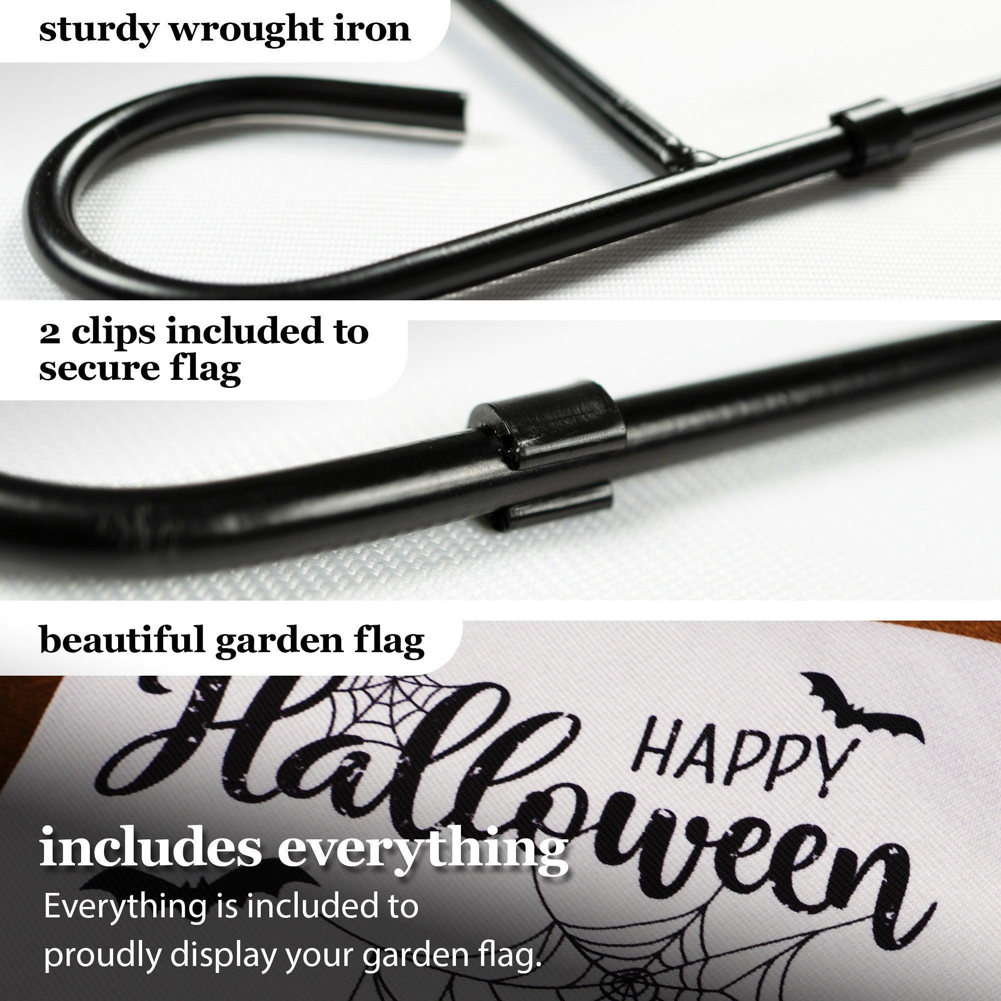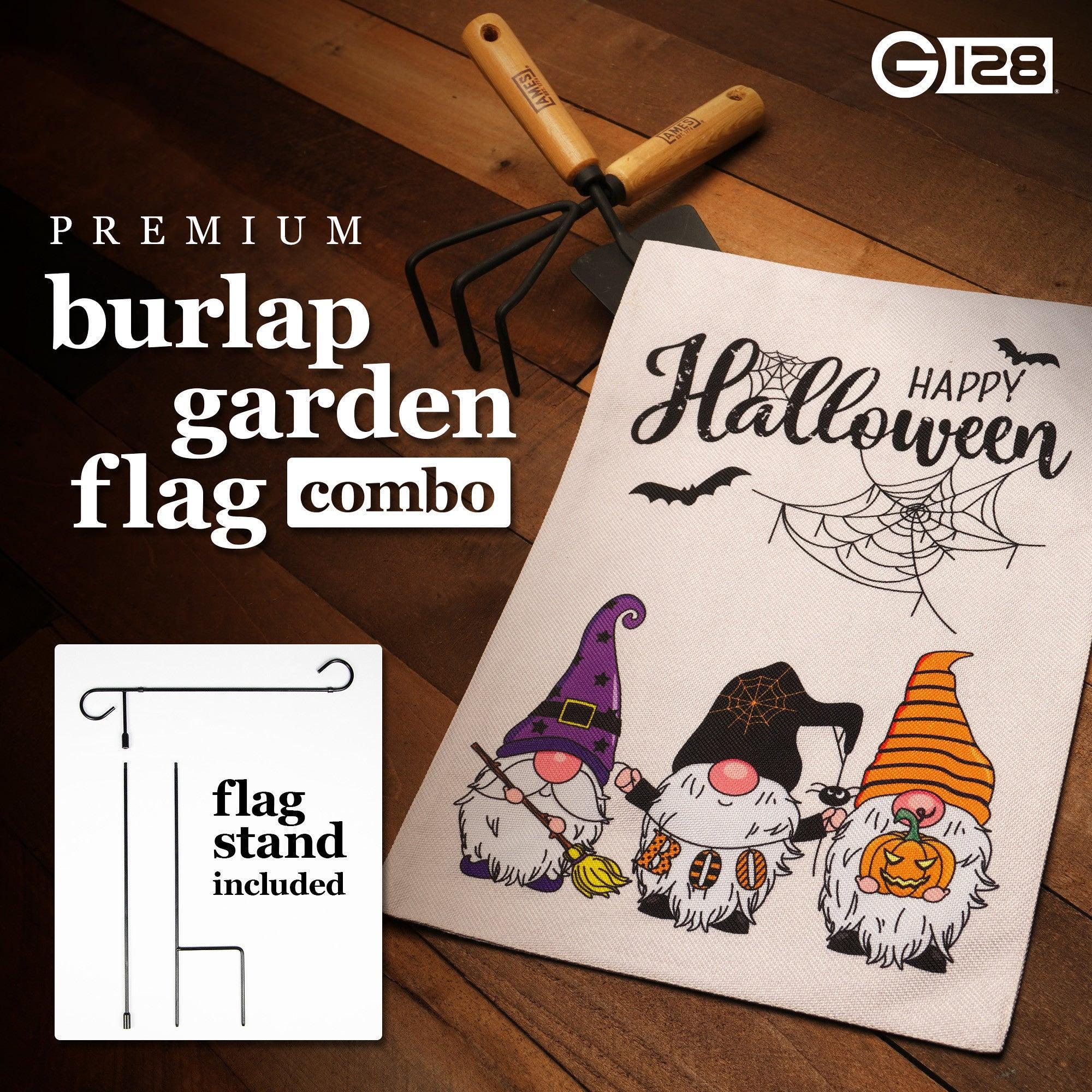 G128 Combo Pack: Garden Flag Stand Black 36 in x 16 in & Garden Flag Happy Halloween Decoration Three Gnomes Spider Web 12"x18" Double-Sided Burlap Fabric