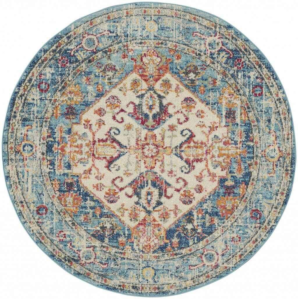 4' Blue And Ivory Round Power Loom Area Rug