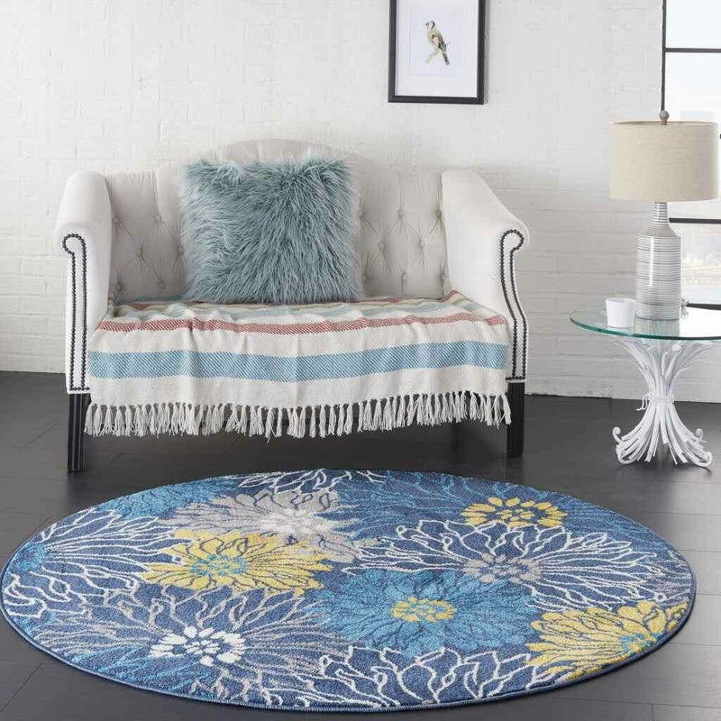 Add some artistry to your room with this 4' blue round floral power loom area rug. This geometric round shaped rug features a floral pattern in blue that combines a good looking print with a unique and updated shape. The mix of shape, color, and design gives this rug refreshing visual interest. Made in Turkey, this rug offers high quality combined with good looking designer sensibilities. Place this area rug against a hardwood or tile floor and it will enliven your living space with style and sophistication. 1" H x 48" W x 48" D