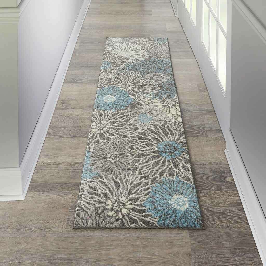 8' Blue And Gray Floral Power Loom Runner Rug