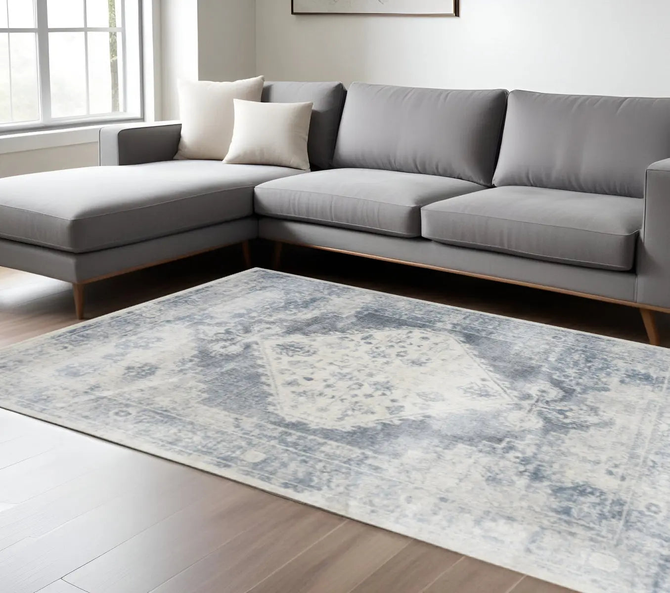 8' X 10' Blue And Ivory Floral Medallion Distressed Washable Area Rug