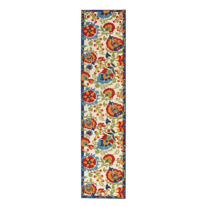 Add great coloration and comfortable texture to your space with this 12-foot green and ivory floral indoor outdoor runner rug. This runner shaped rug features a floral design that will work well both indoors or out. A classic shape marries with good looking design for your living room, hall, bedroom, porch, patio, or poolside. Versatile in use, durable, and easy to maintain, this rug is an ideal solution to add a decorative and inviting touch to your indoor or outdoor space. 27-inch h x 144-inch w x 1-inch d.