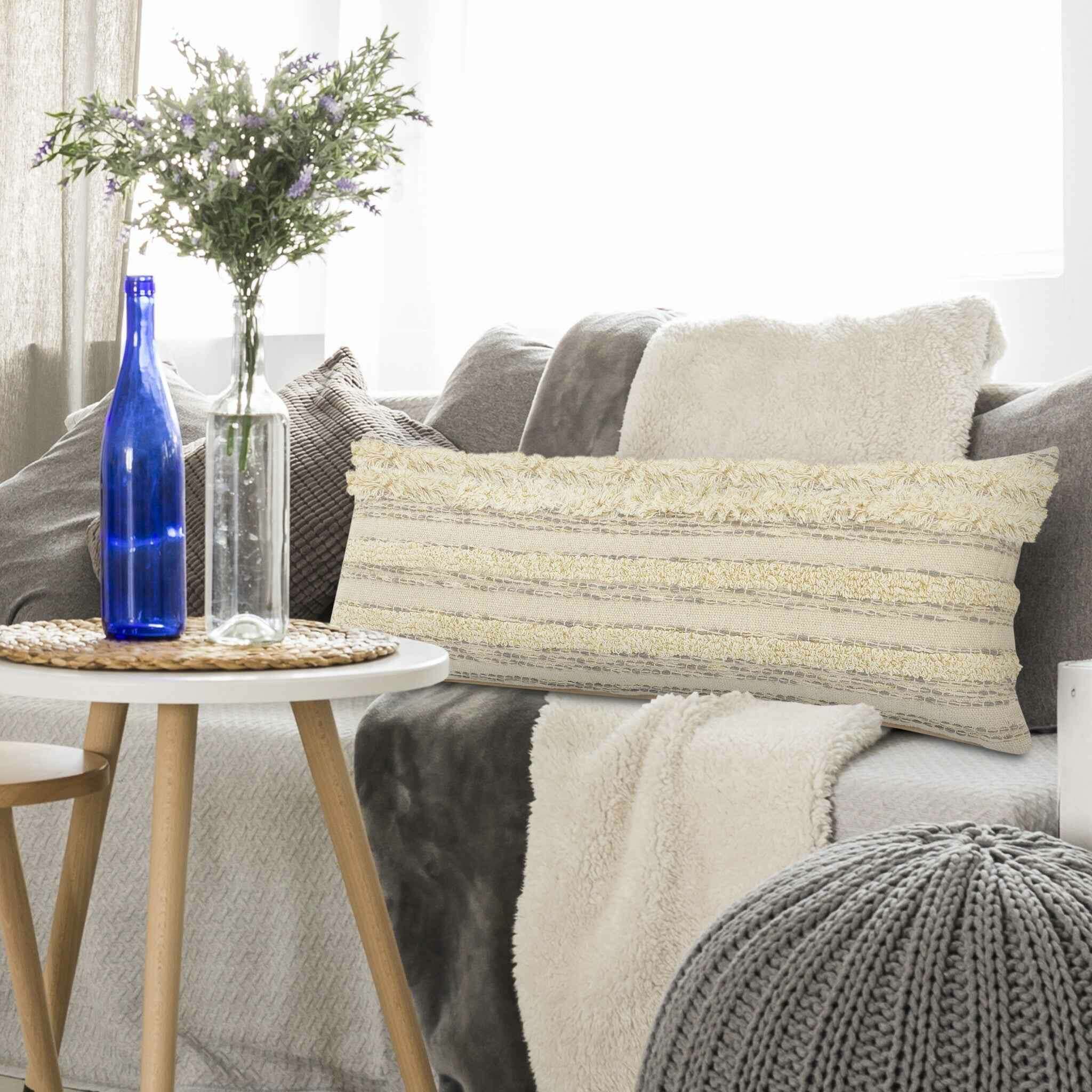 14" X 36" Cream Gray And Gold 100% Cotton Striped Zippered Pillow