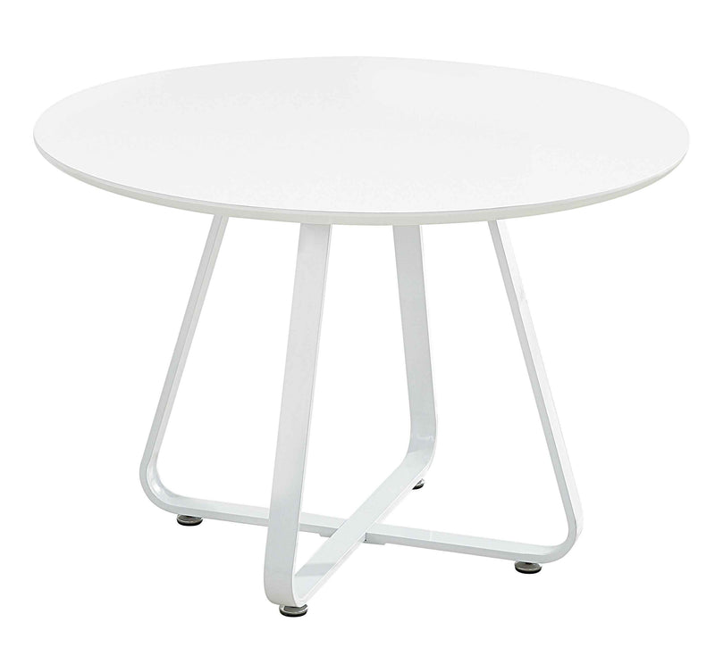 Make a statement with the 43-inch white wood and metal sled base round top dining table and infuse a dash of character and personality into your space. This table features an updated monotone color scheme with white as the main color on both the manufactured wood top surface and the metal base legs. A shiny and sheer gloss finish gives this table a bit of a modern and contemporary vibe. A beautiful sled base adds some dimension and elegance to your dining. Seat up to 6 family and friends around your new dining table. This table is the sturdy, reliable and stylish answer to your dining room needs. The dining table is a symbol for togetherness, special meals, and conversation. This 43-inch white wood and metal sled base round top dining table is a must-have for your home. 30-inch h x 43-inch w x 43-inch d.
