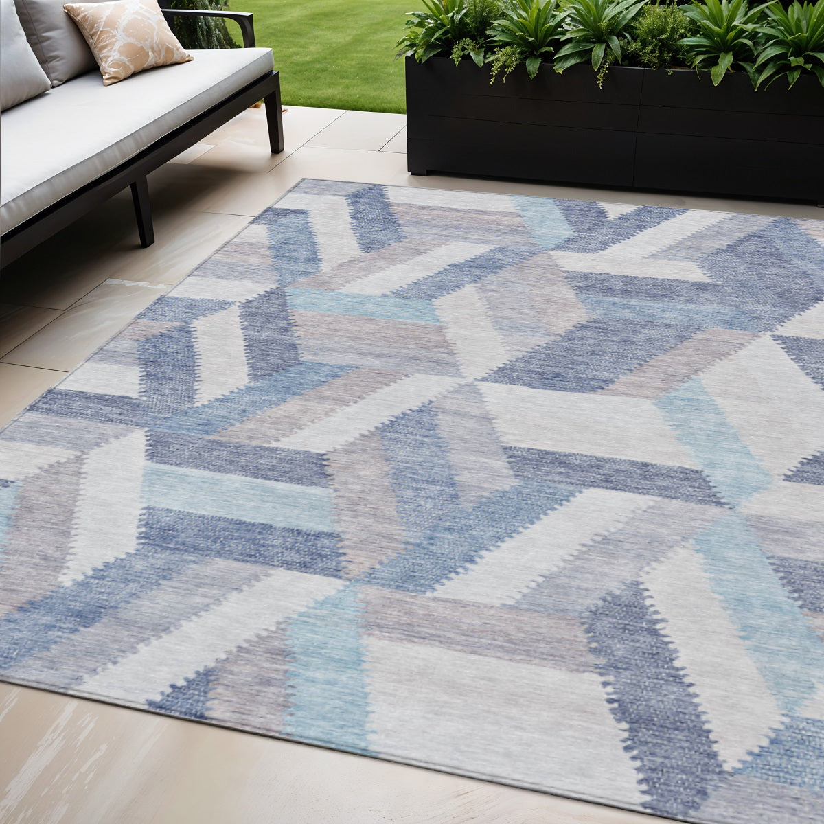 5' X 8' Denim Blue Geometric Washable Indoor Outdoor Area Rug