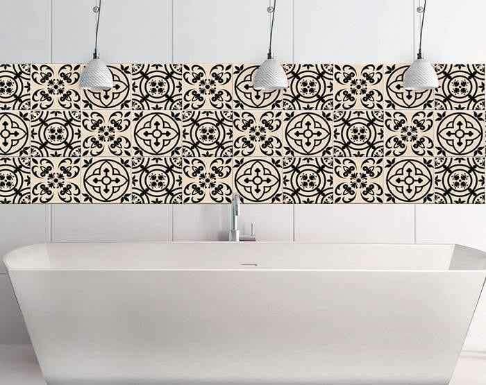 The possibilities are endless with these 7" x 7" Cream and Black Mosaic Peel and Stick Removable Tile stickers. These fabulous peel and stick tiles will add sophisticated flair and design to your kitchen backsplash, fireplace mantel, stair treads, half wall, bathroom or nook. These 7" square tile stickers are an easy, no mess solution to complete a personalized and colorful room makeover. Easy to apply on any clean dry flat surface, and easy to remove. Multi use and multi-room appeal make this design option is perfect for renters, landlords, college students and homeowners alike. Peel and stick tile decals make it easy to turn your space into a home. Removable without damage to surfaces. One kit contains 24 stickers. Kit includes multiple design styles and colorations to be displayed in any arrangement you choose.