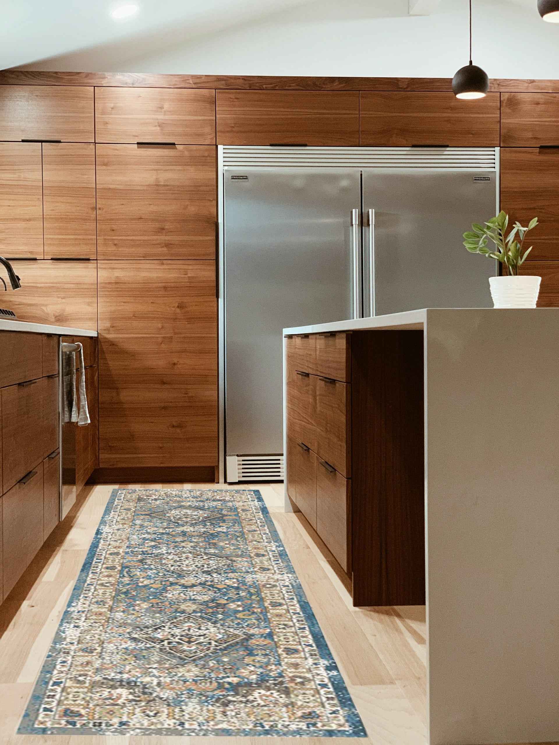 8' Blue and Brown Oriental Distressed Runner Rug With Fringe - Passer au contenu