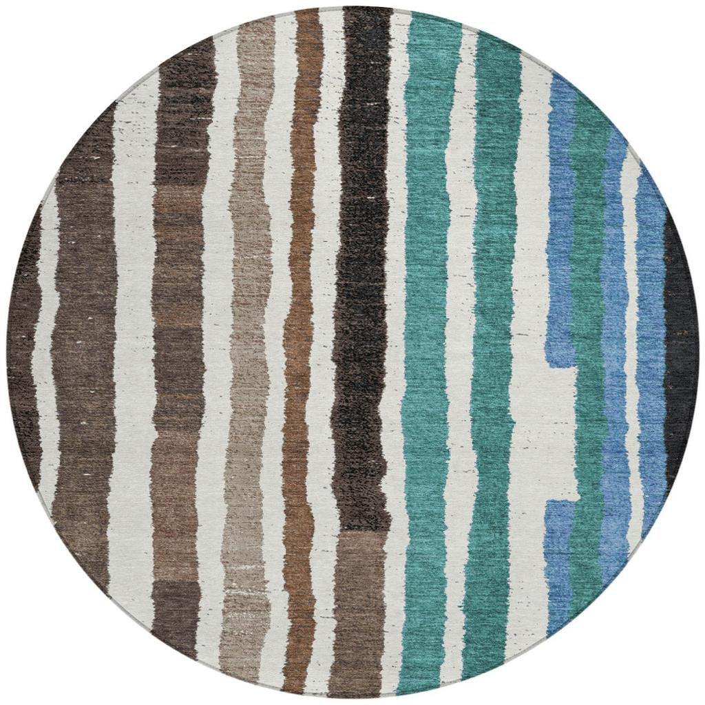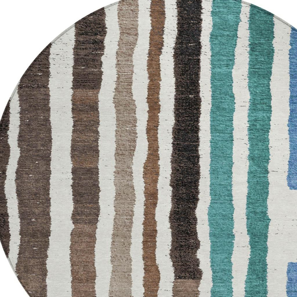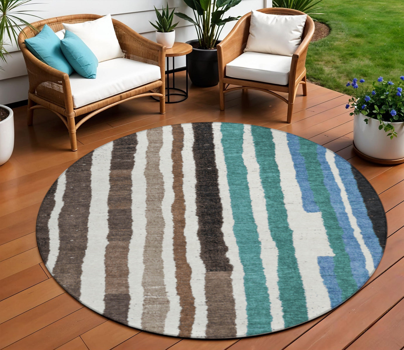 8' Brown Teal Blue And Ivory Round Striped Washable Indoor Outdoor Area Rug