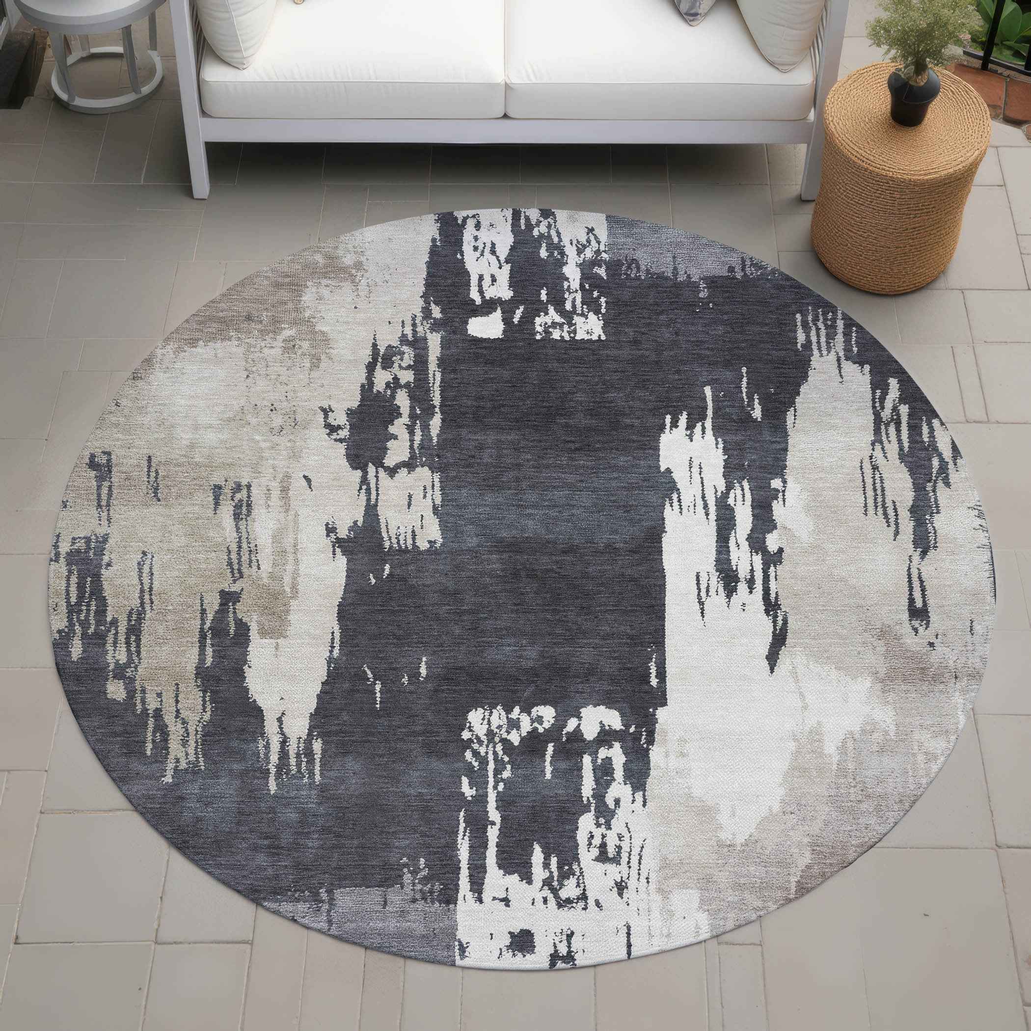 8' Charcoal Ivory And Beige Round Abstract Washable Indoor Outdoor Area Rug