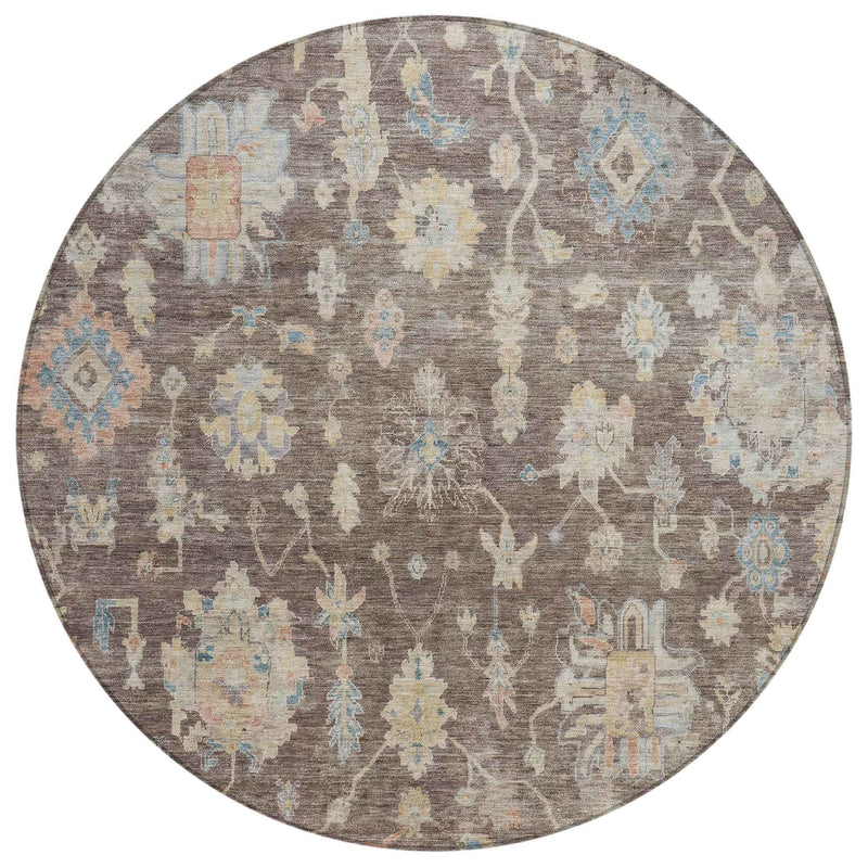 8' Chocolate Beige And Blue Round Floral Washable Indoor Outdoor Area Rug