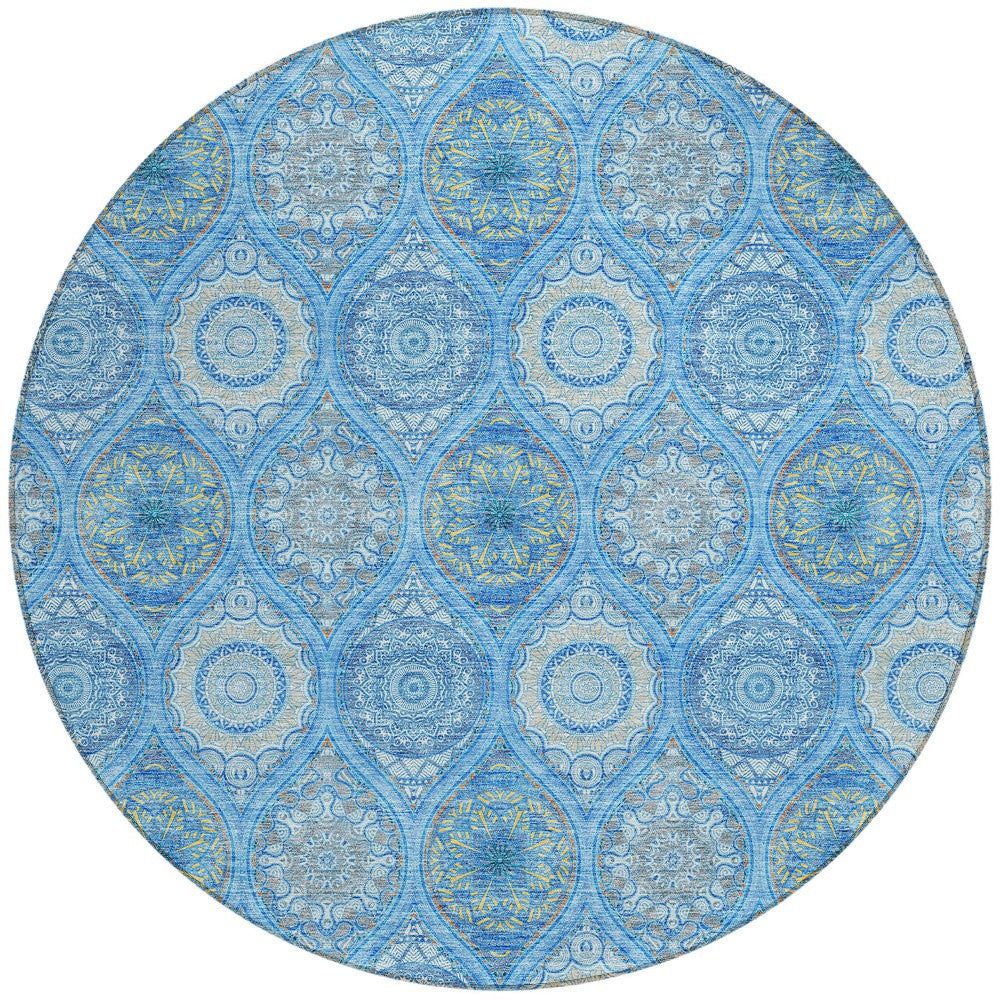 8' Denim Blue Sky Blue And Ivory Round Floral Medallion Washable Indoor Outdoor Area Rug