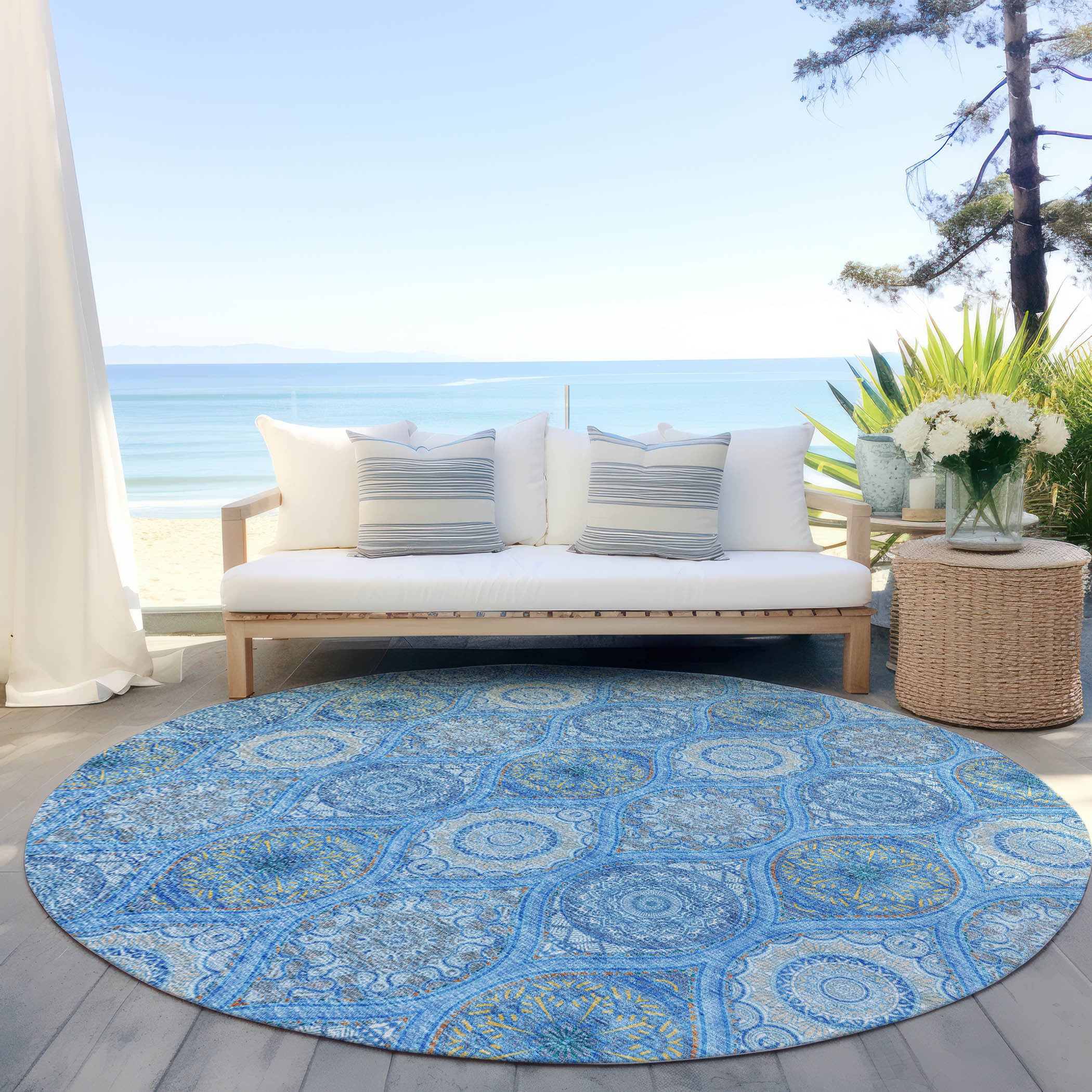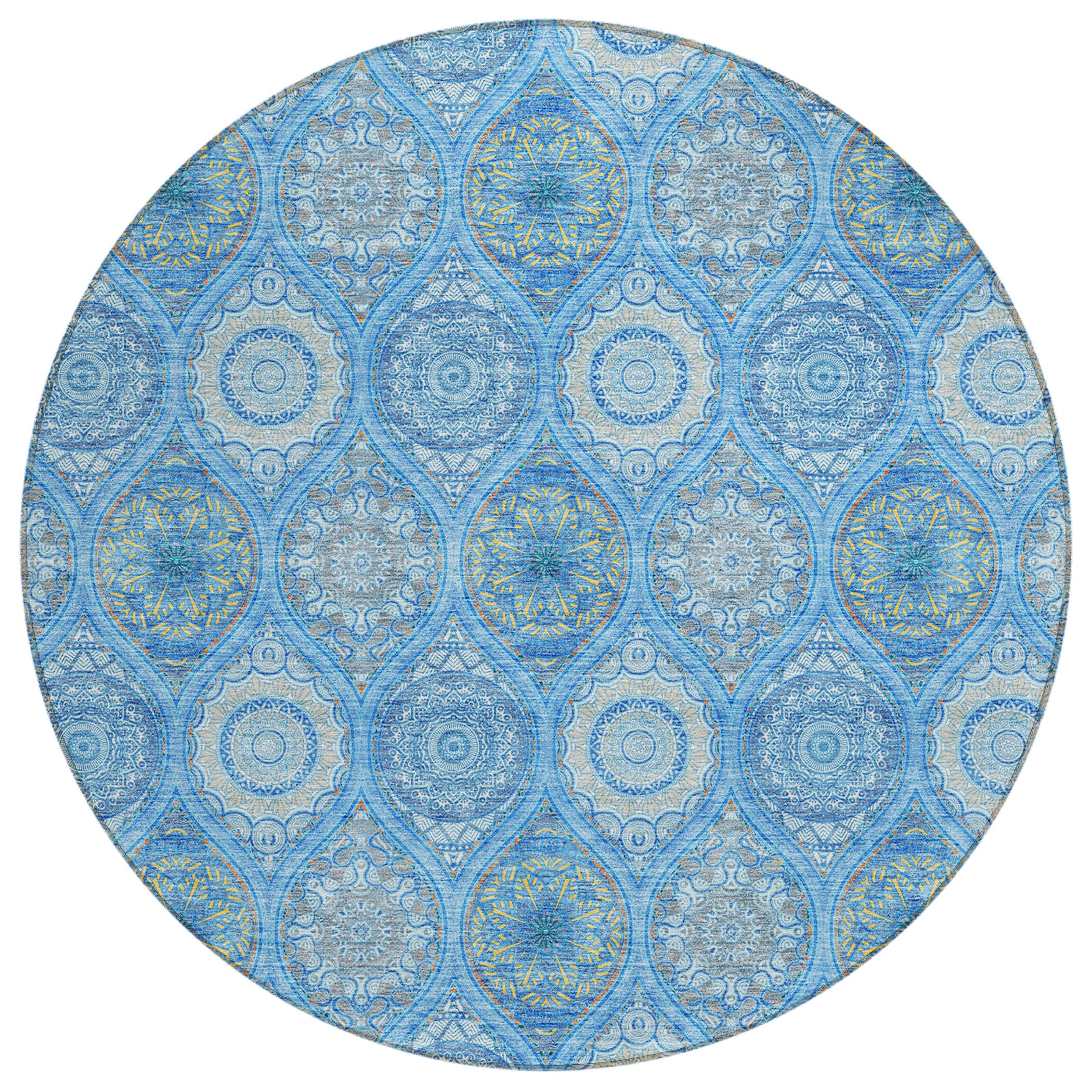 Add some artistry to your room with this 8-foot denim blue sky blue and ivory round floral medallion washable indoor outdoor area rug. This geometric round shaped rug features a floral medallion pattern in denim blue, sky blue, and ivory that combines a good looking print with a unique and updated shape. The mix of shape, color, and design gives this rug refreshing visual interest. Ideal for outdoor spaces or high traffic areas with kids and pets, this rug is made from heavy duty polyester that is stain resistant to help repel water, dirt, and stains. Makes a great way to dress up your patio, porch, or poolside, but also works well as a durable and easy to maintain option in the kitchen, family room, or mudroom. 96-inch h x 96-inch w x 0.19-inch d.