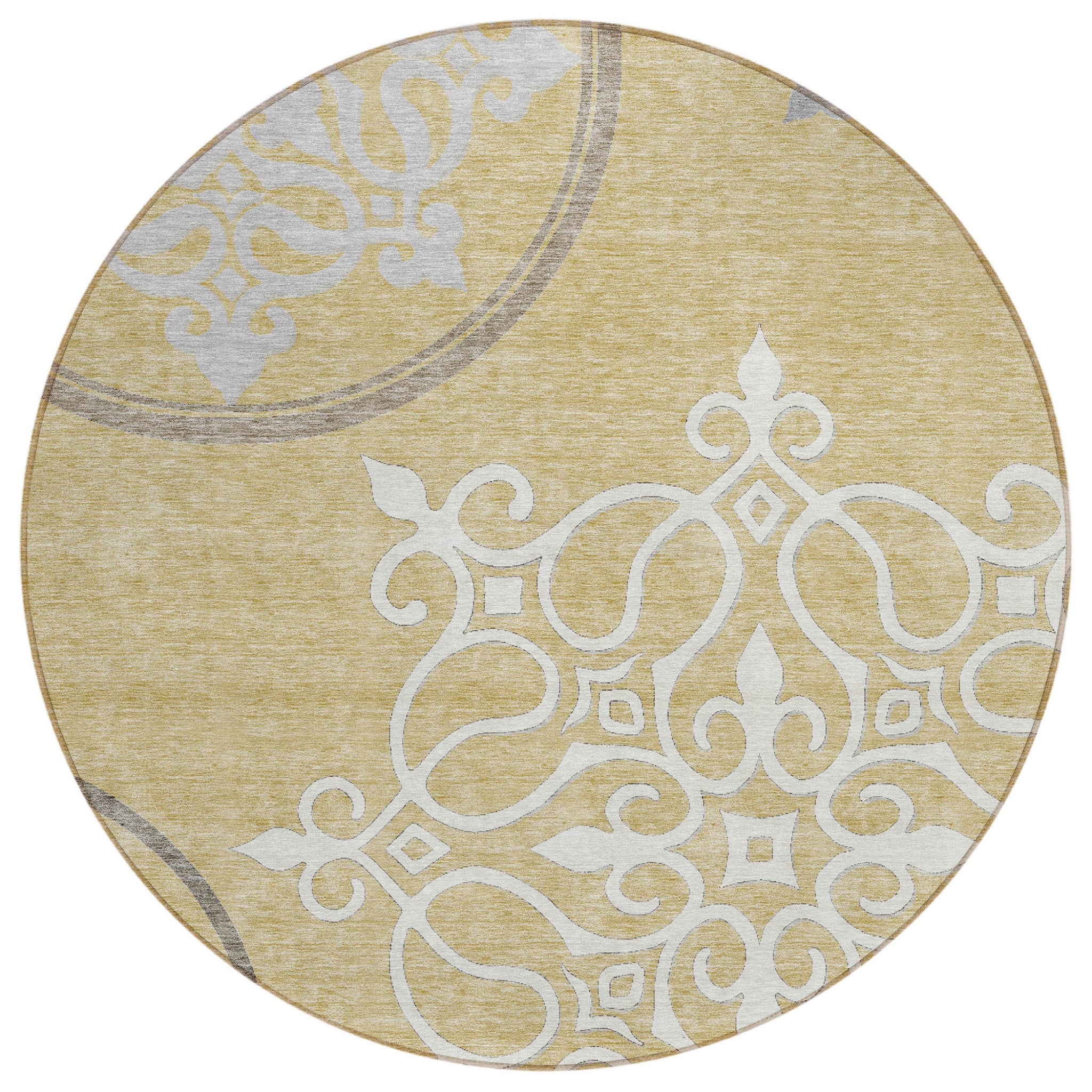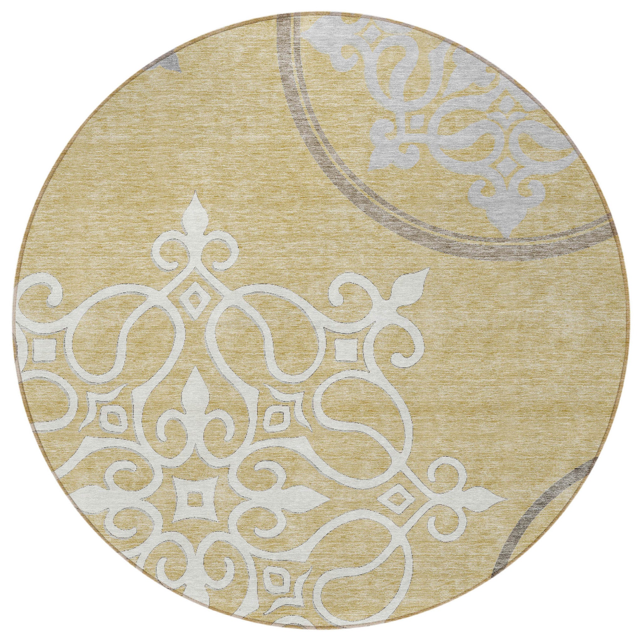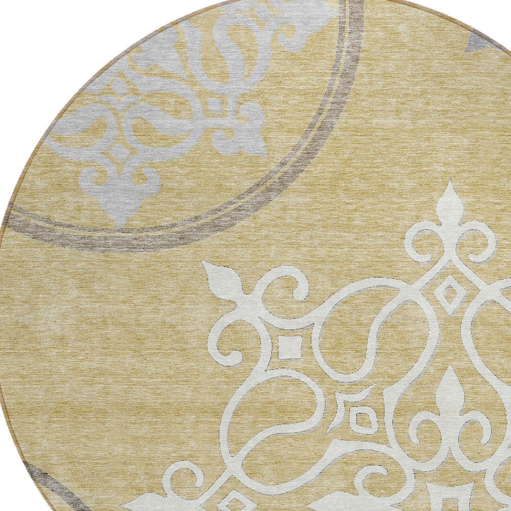 8' Gold Ivory And Gray Round Floral Medallion Washable Indoor Outdoor Area Rug
