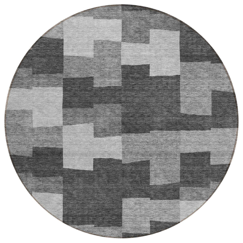 8' Gray Silver And Charcoal Round Geometric Washable Indoor Outdoor Area Rug
