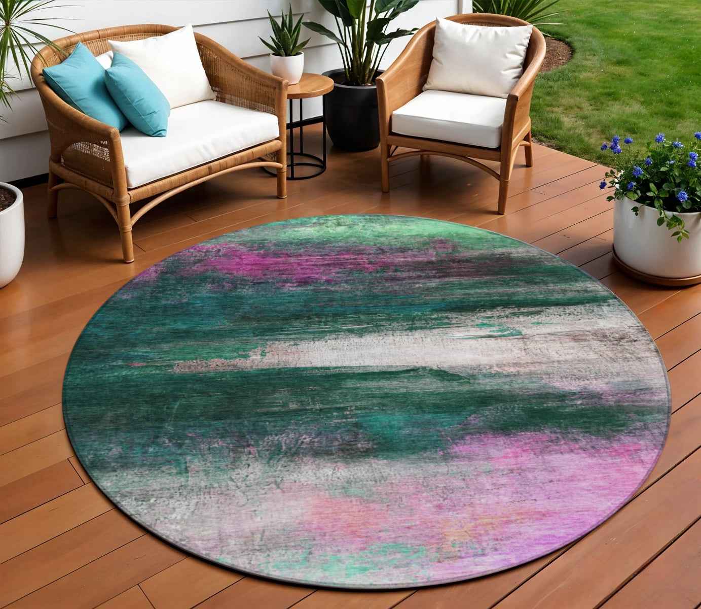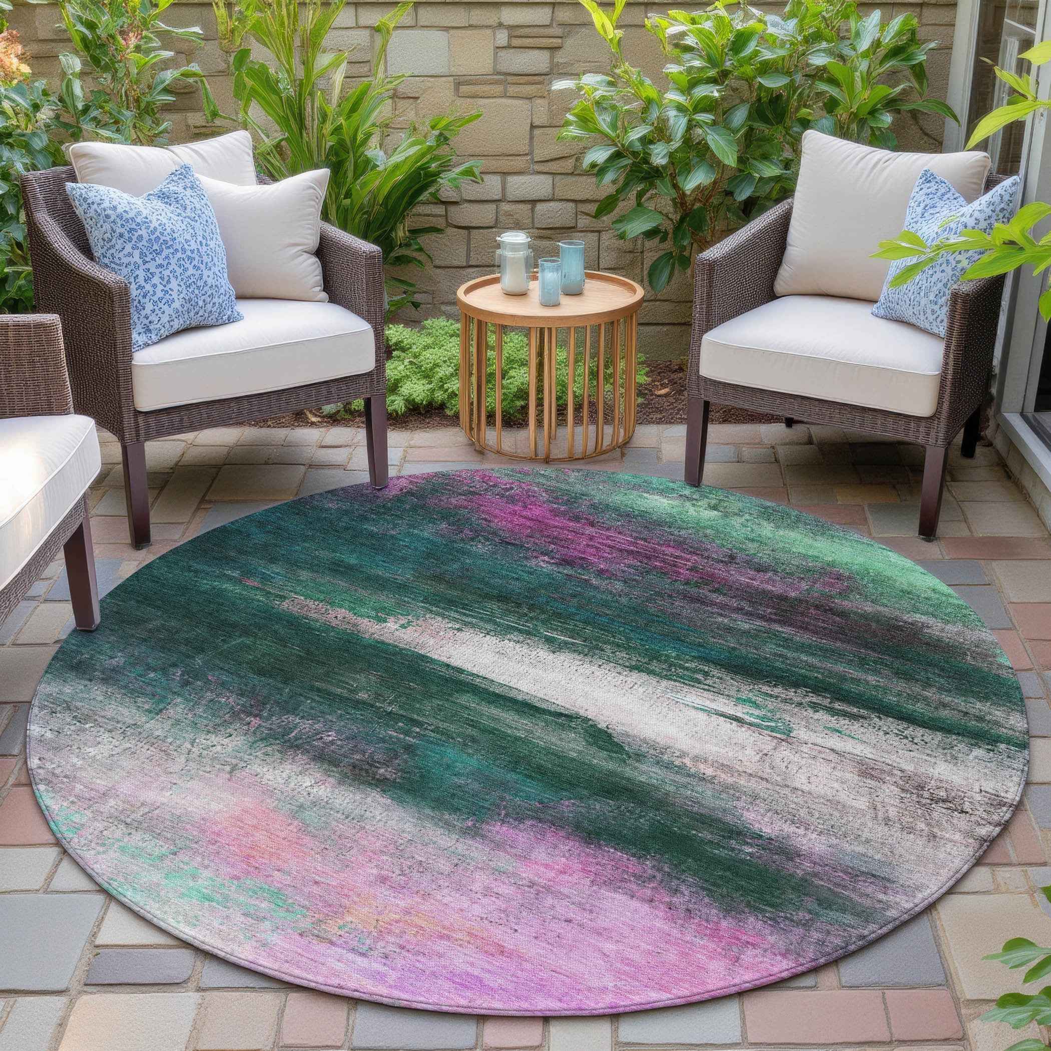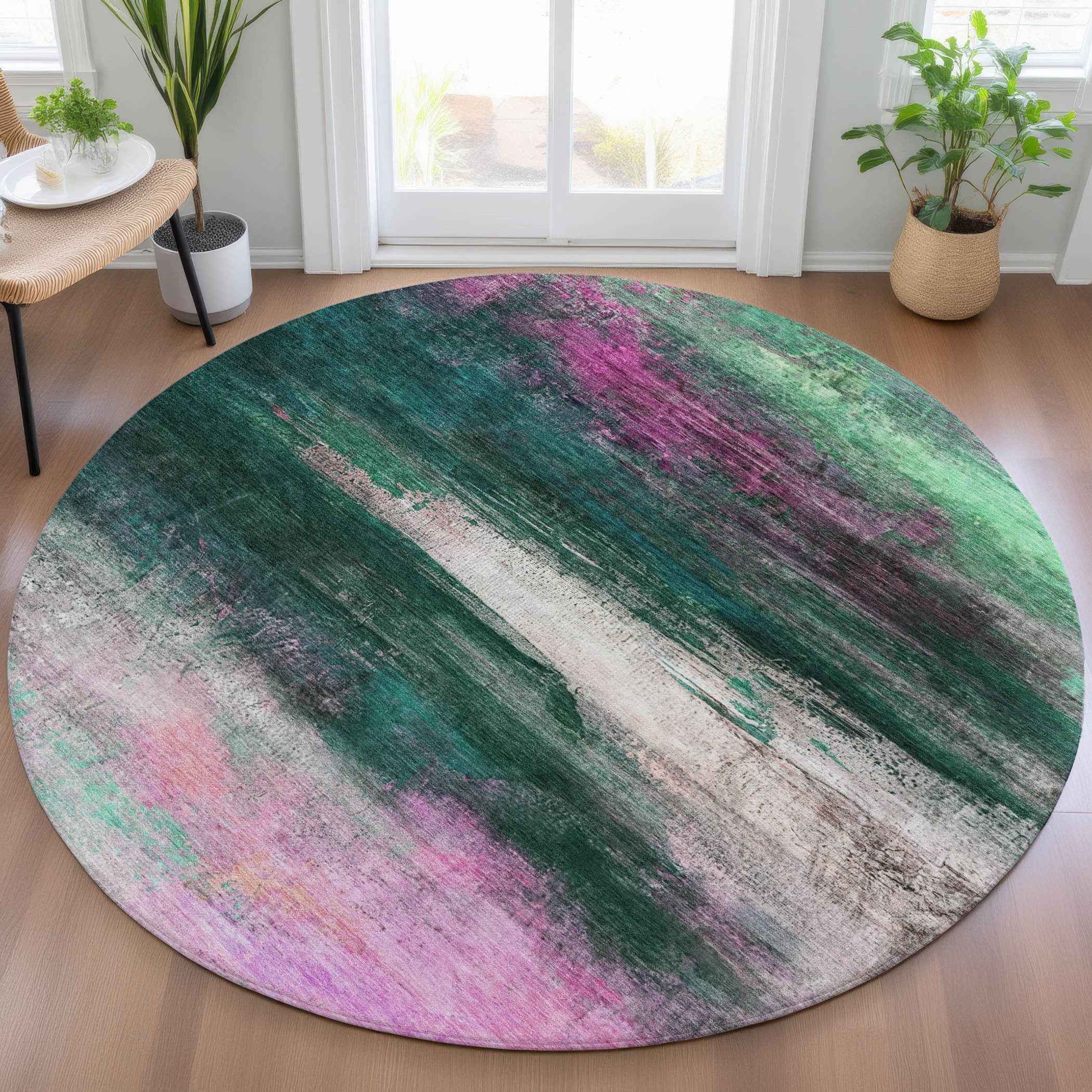 8' Green Blush And Ivory Round Abstract Washable Indoor Outdoor Area Rug