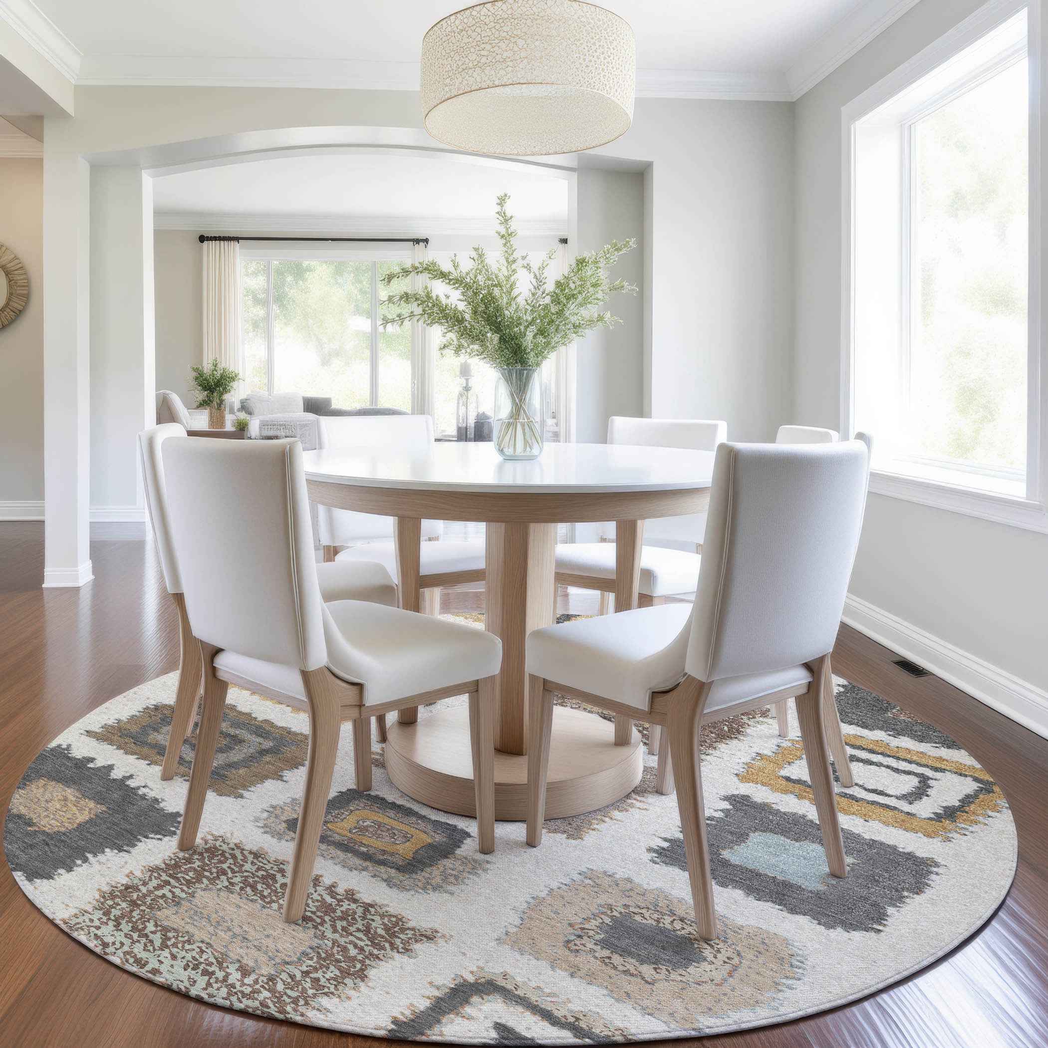 Add great coloration and comfortable texture to your space with this 8-foot ivory charcoal and gold round geometric washable indoor outdoor area rug. This geometric round shaped rug features a geometric pattern in ivory, charcoal, and gold that combines a good looking print with a unique and updated shape. The mix of shape, color, and design gives this rug refreshing visual interest. Ideal for outdoor spaces or high traffic areas with kids and pets, this rug is made from heavy duty polyester that is stain resistant to help repel water, dirt, and stains. Makes a great way to dress up your patio, porch, or poolside, but also works well as a durable and easy to maintain option in the kitchen, family room, or mudroom. 96-inch h x 96-inch w x 0.19-inch d.