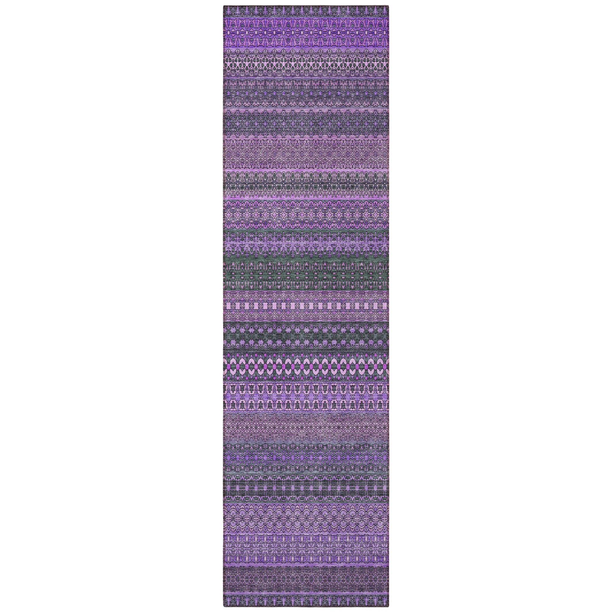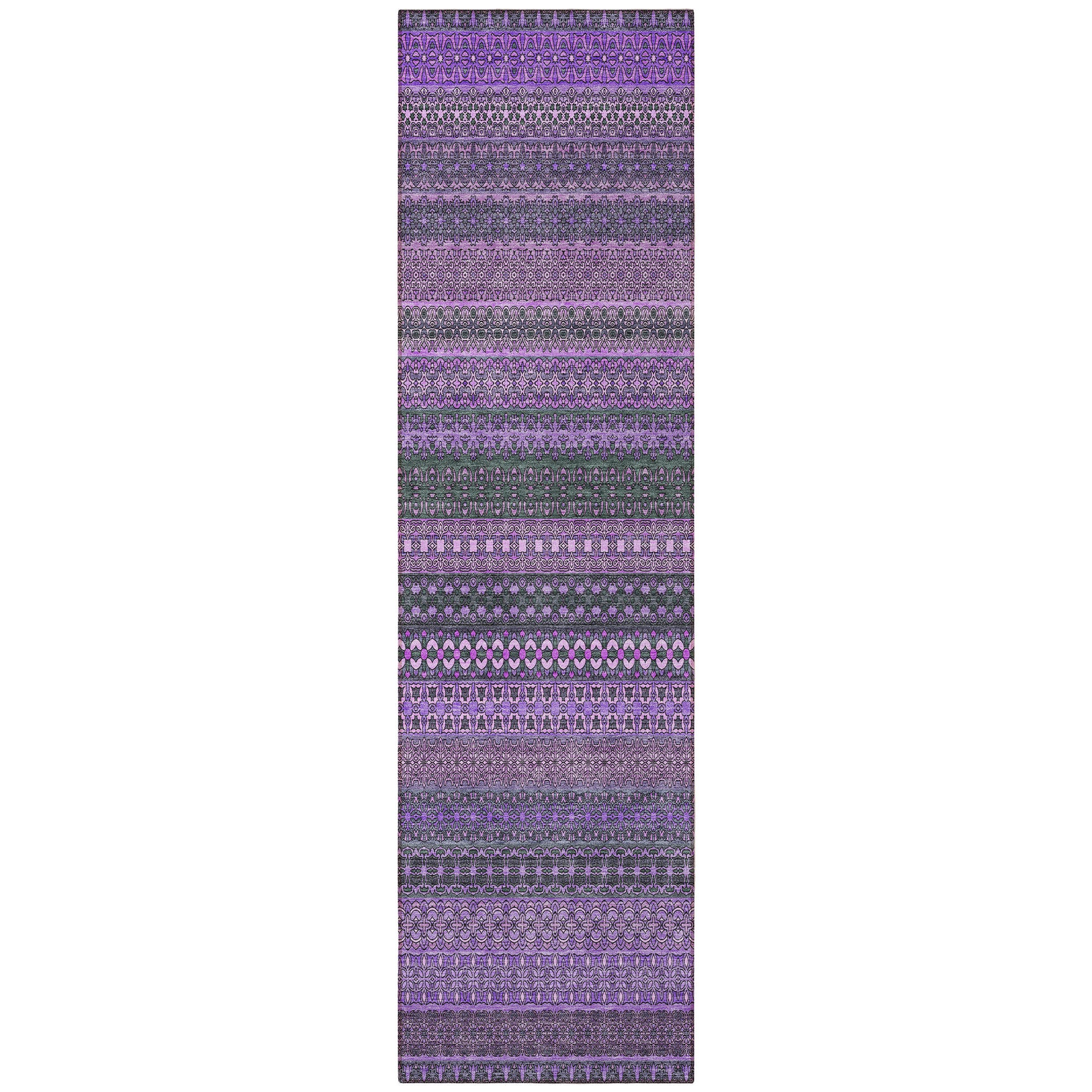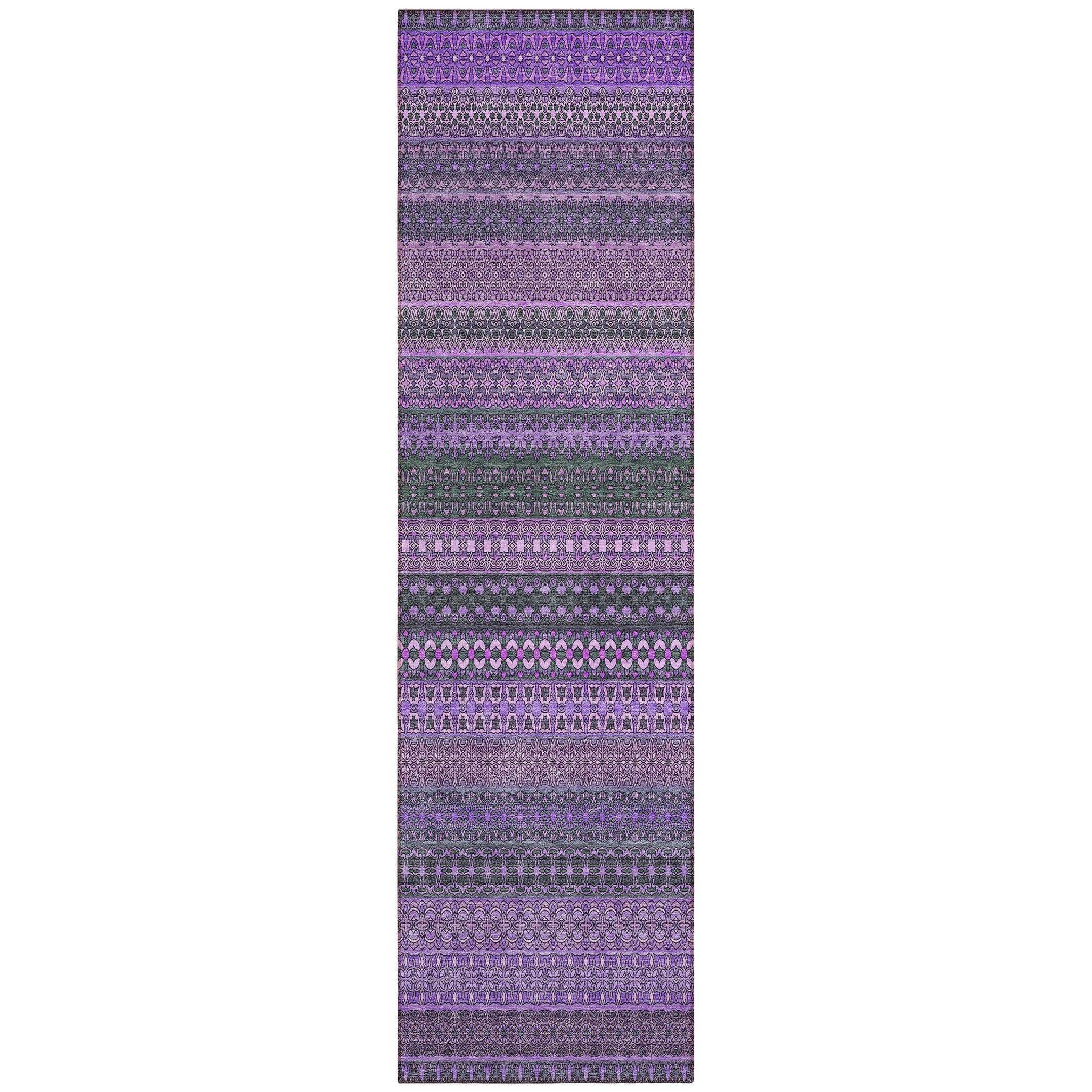 This 8-foot runner purple striped washable stain resistant non skid indoor outdoor runner rug, is a great way to add warmth to a room. This runner shaped rug features a striped design in purple to give it visual interest. A classic shape marries with good looking design for your space ideal for spaces with kids and pets, this rug is stain resistant to help repel stains and spilled liquids. Area rugs help to give warmth and sense of home to your space. 27-inch H x 90-inch W x 0.19-inch D