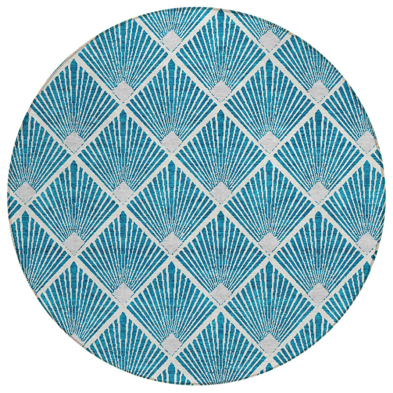 8' Teal Blue And Ivory Round Geometric Washable Indoor Outdoor Area Rug