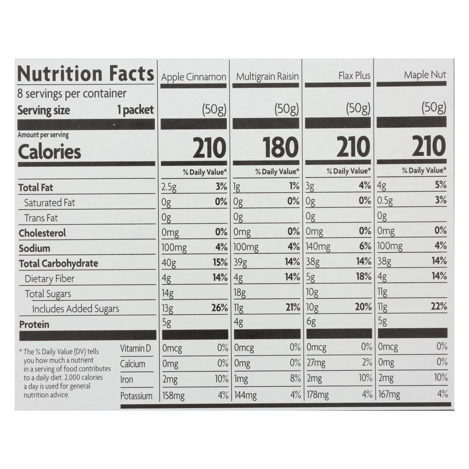ingredients : apple cinnamon: whole grain rolled oats;cane sugar;dried apple;cinnamon;sea salt;apple flavor;flax plus®: whole grain rolled oat;flax seeds;maple nut: whole grain rolled oats;pecans;maple sugar;natural maple flavor;multigrain raisin: whole grain rolled oat;wheat flakes;raisin;coated with sunflower oil