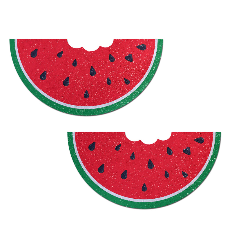 Pastease Watermelon with Bite Glitter Velvet. Introducing Pastease's Watermelon Slice with a Bite Full Breast Covers Support Tape: a delightful and supportive addition to your Spring and Summer wardrobe. These covers provide the perfect blend of coverage and style, ensuring you feel confident and comfortable with their midsize design. Here is why they are a must have. Coverage for Every Size. Tailored for the modest user and ideal for cup sizes C and up, these covers offer just the right amount of coverage for comfort and confidence. Additional Lift and Support. Providing more than just coverage, these covers offer additional lift and support to enhance your natural shape. Soft Glitter Velvet Material. Crafted from a soft and luxurious glitter velvet material, these covers feel gentle against your skin for a comfortable and stylish experience. Mess free Glitter. Enjoy the sparkle without the mess. Our mess free glitter will not shed, ensuring a clean and polished look. Thin and Discreet Design. The thin profile of the velvet ensures discreet coverage, allowing you to wear them confidently under your favorite outfits. Vibrant Watermelon Design. Featuring a red watermelon slice with a green shell and black seeds, these covers add a playful touch to your wardrobe – can you spot the heart seed?