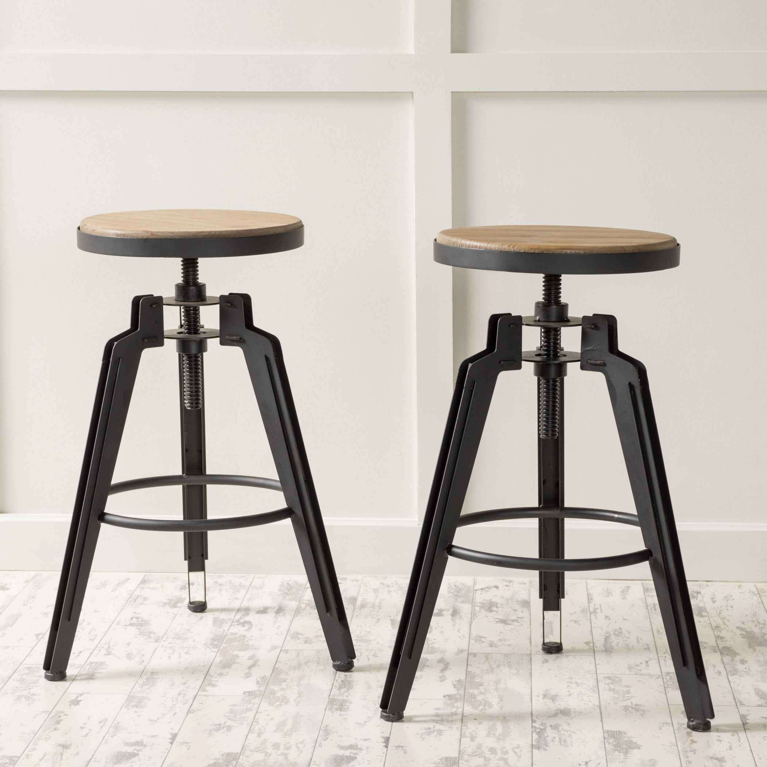 Set of Two Natural and Black Iron and Wood Backless Adjustable Height Swivel Bar Chairs