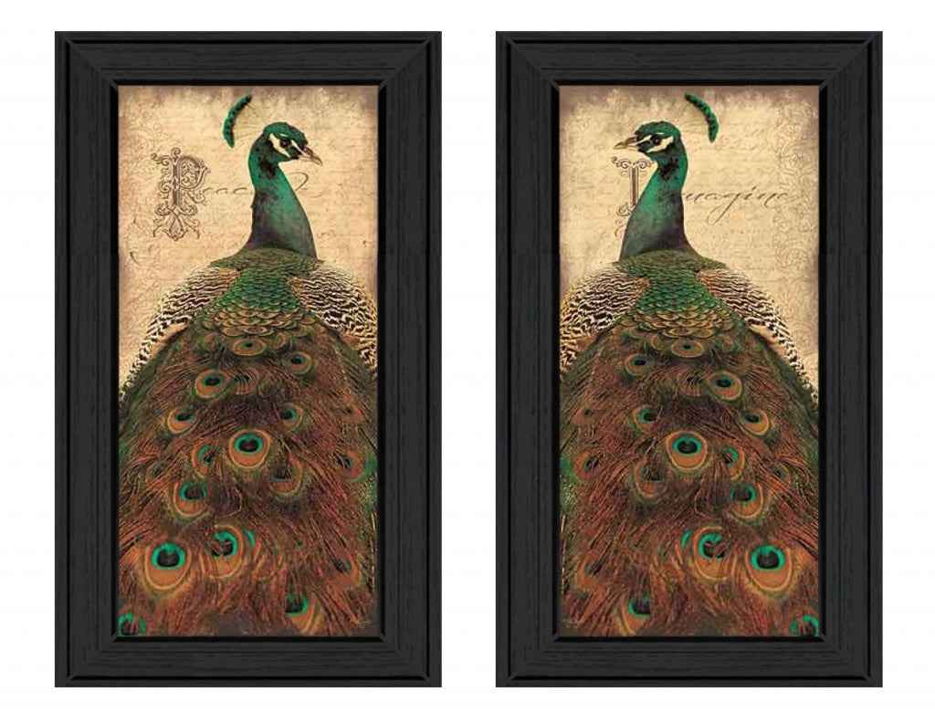 Unique and decorative, this set of two peacock 2 black framed print wall art will leave a lasting impression. Known for their striking coloring, this peacock inspired artwork will be a great addition to your space. This print is a visual artistic expression that allows you to decorate your space in style. Reproduced for you on paper, this hanging decorative accent will be a trendy and fashionable way to dress your walls. Hang on your wall to add some up to date fashion and decoration. Utilize this opportunity to create a focal point in the room with this fabulous wall decor option. 20 inches H x 22 inches W x 1.5 inches D