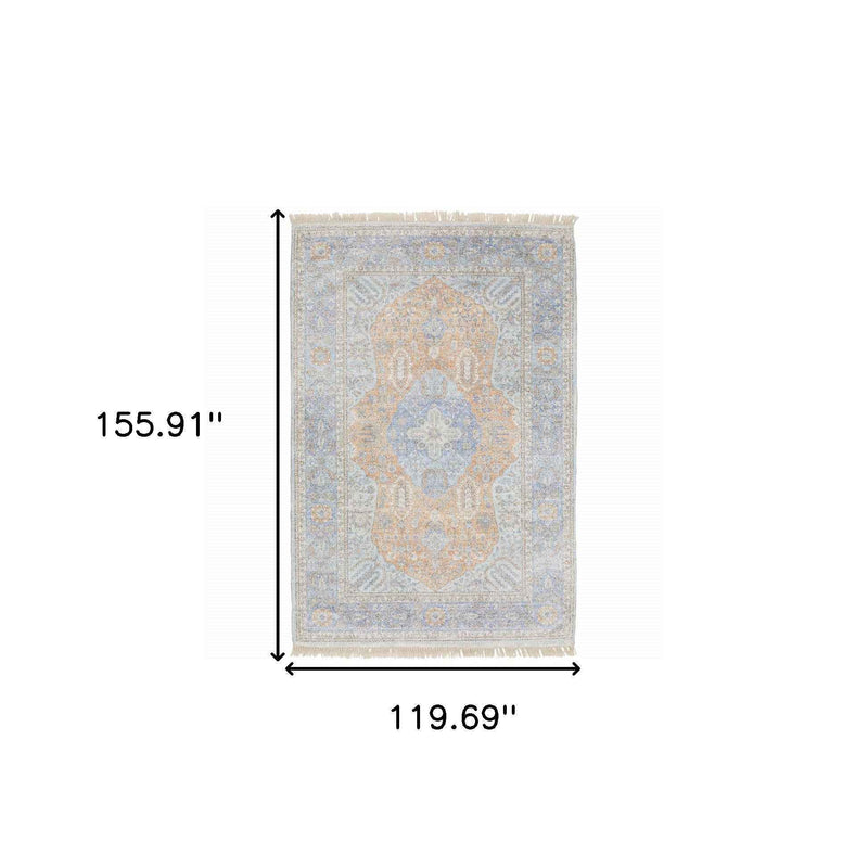 10' X 13' Blue And Red Oriental Hand Loomed Stain Resistant Area Rug With Fringe