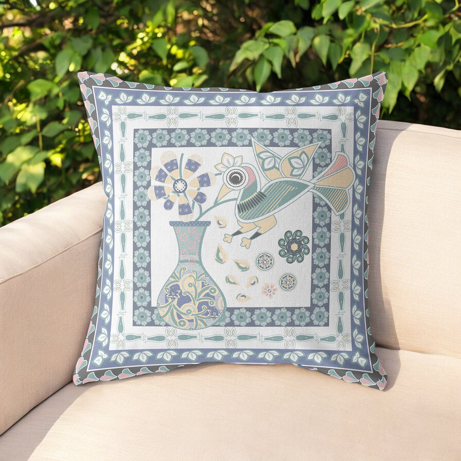 18" x 18" Blue and White Bird Blown Seam Floral Indoor Outdoor Throw Pillow