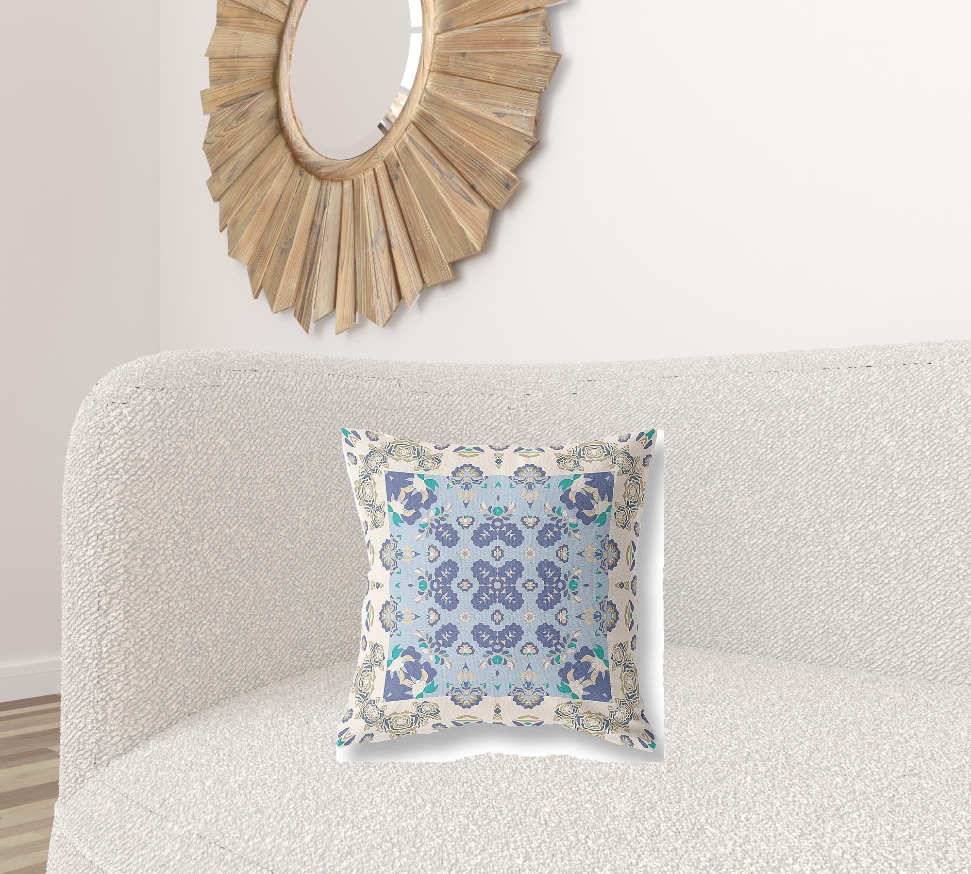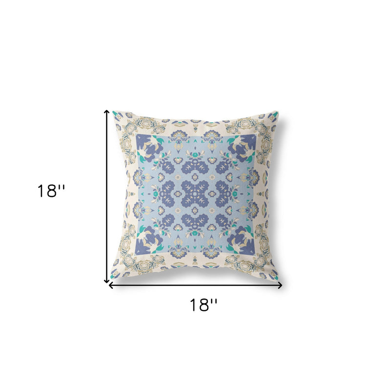 18" X 18" Off White And Blue Floral Blown Seam Suede Throw Pillow