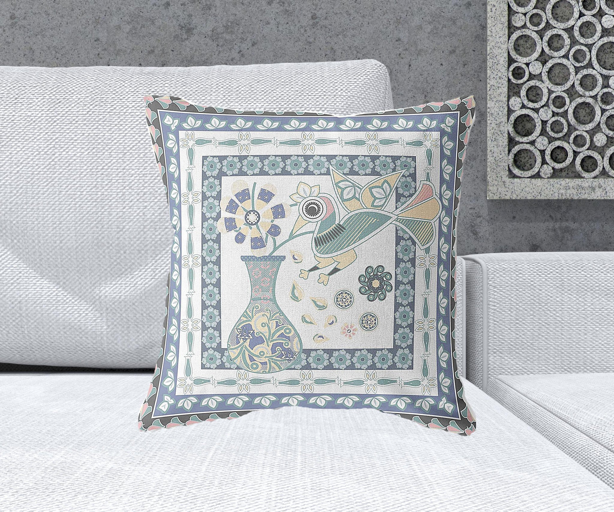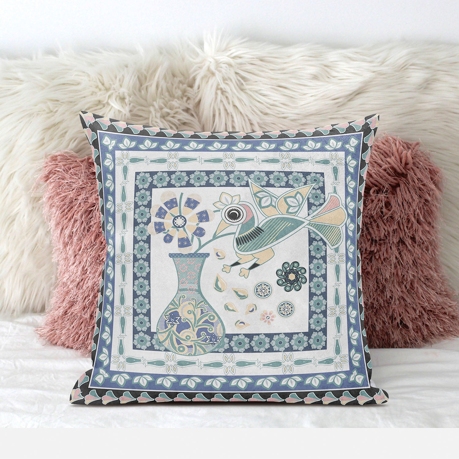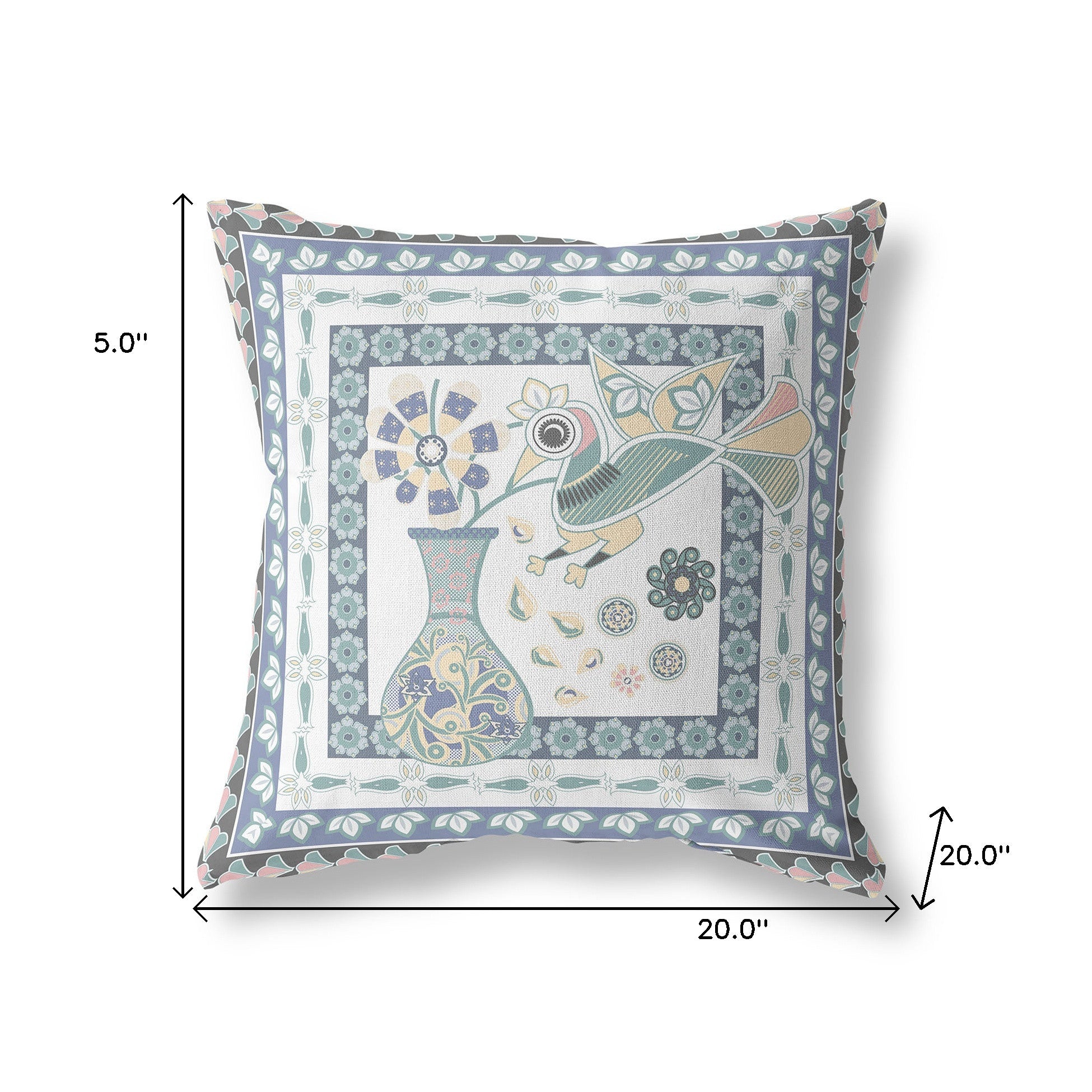 20" x 20" Blue and White Bird Blown Seam Floral Indoor Outdoor Throw Pillow