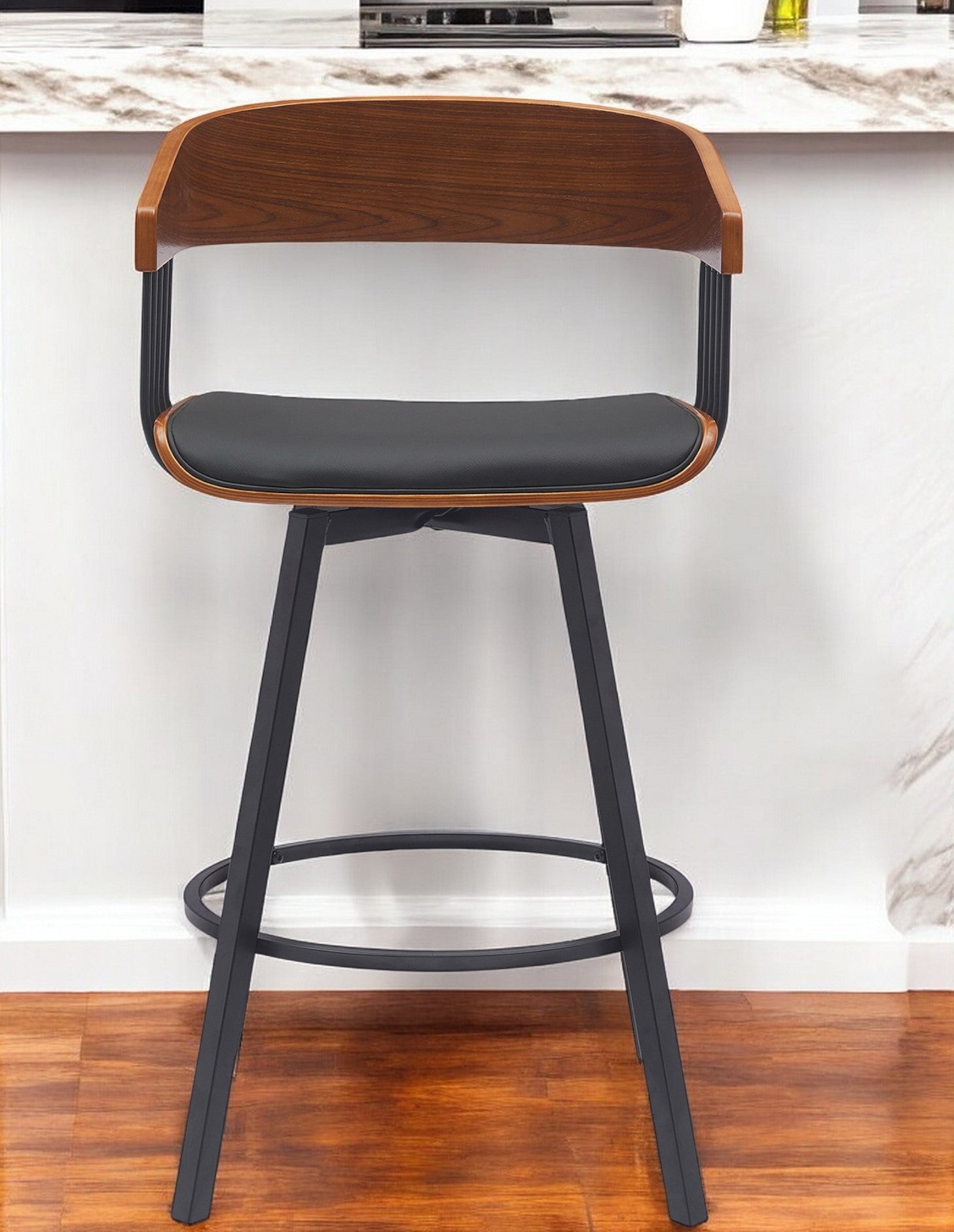 27" Black Faux Leather And Metal Swivel Low Back Counter Height Bar Chair