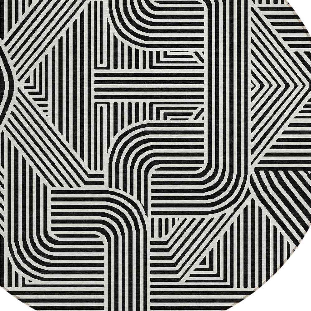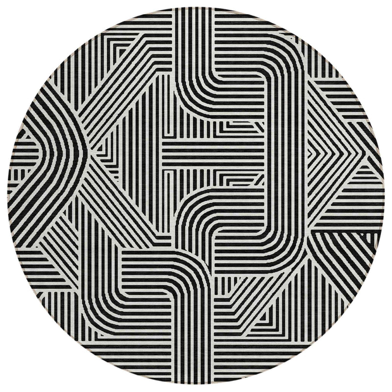 8' Black And Ivory Round Abstract Washable Indoor Outdoor Area Rug