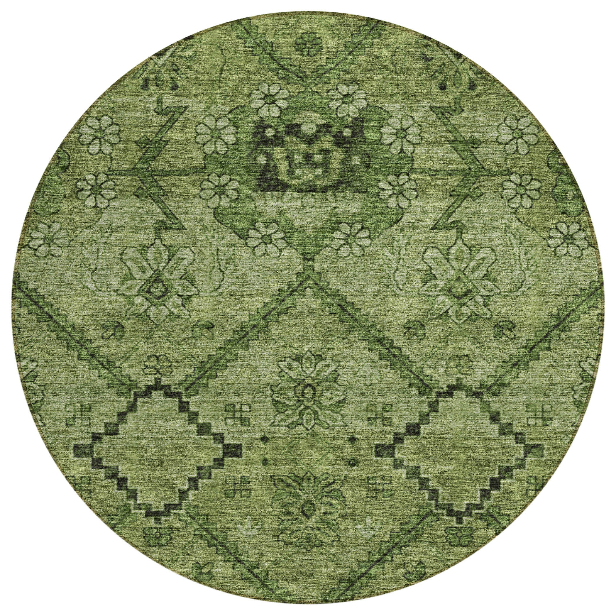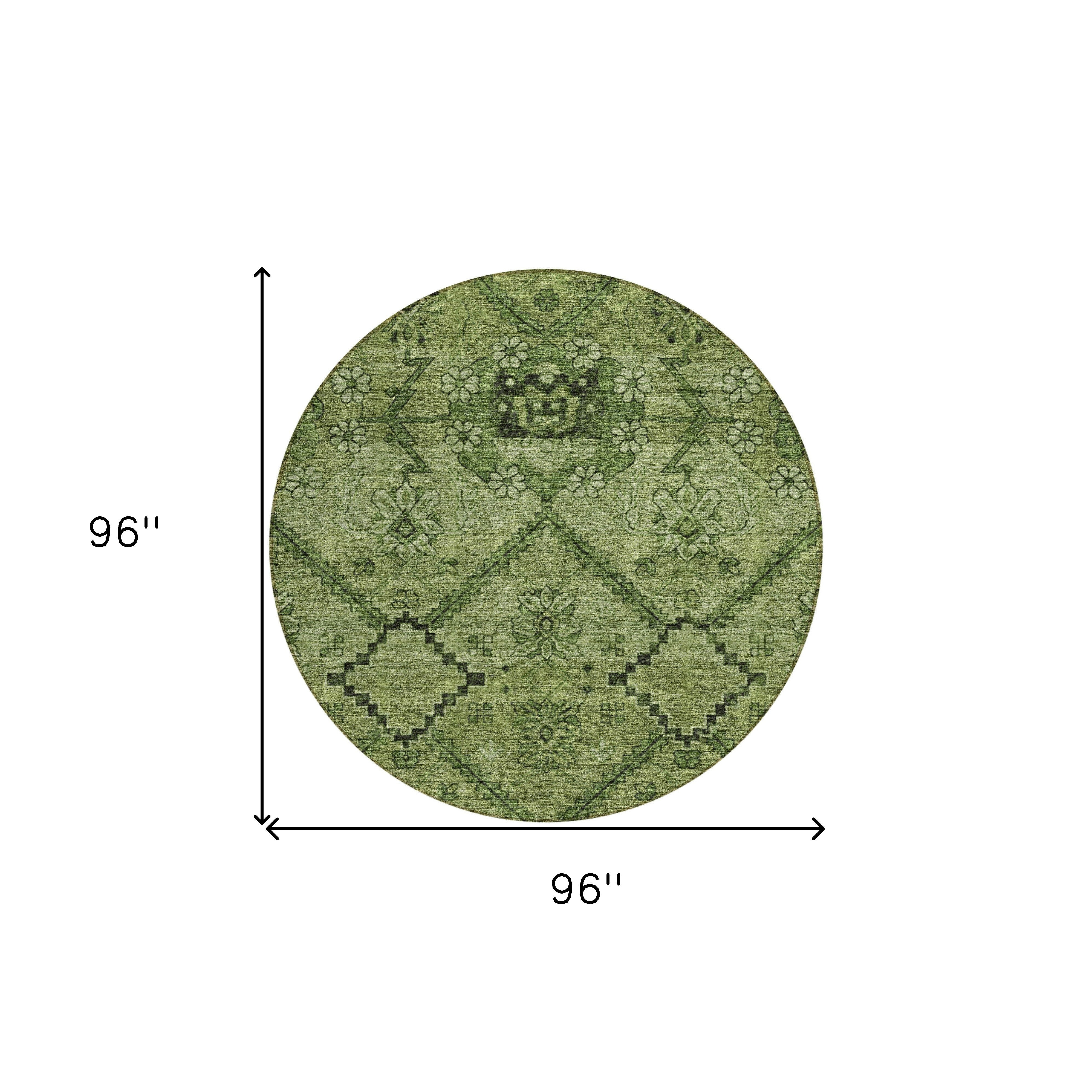 8' Olive Green Fern Green And Artichoke Green Round Floral Washable Indoor Outdoor Area Rug